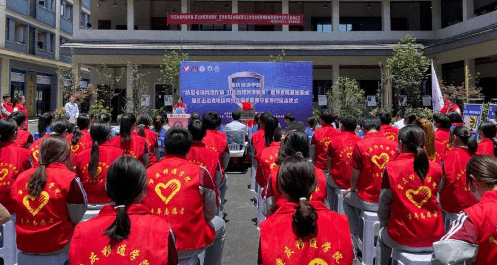 在綦河书院无界空间,举行了重庆移通学院反诈骗宣传教育基地落成暨校园反诈骗集中宣传月启动仪式。提高大家的反诈骗意识,让每位同学拥有“火眼金睛”,能够“识骗局、破骗局”,将反诈骗深深刻进“DNA”里。