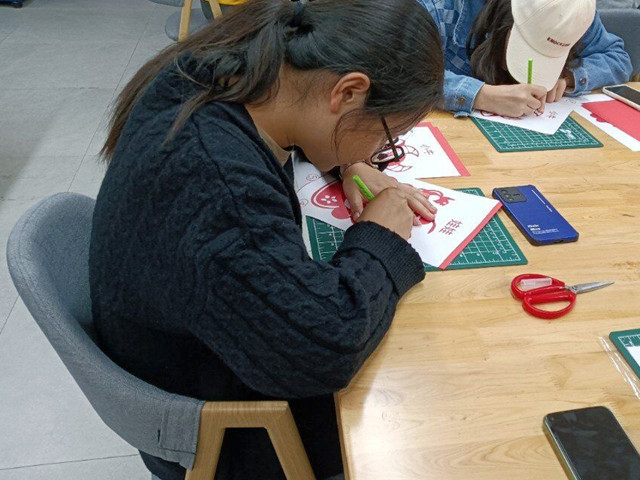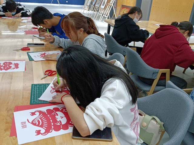 接着,展厅内所有同学埋头苦干,大家都沉浸在剪纸的过程当中。在剪纸中可以修身养性,让自己浮躁的内心静下来。一个小时之后,同学们都陆续的完成了作品。同学们对自己的作品都比较满意,纷纷询问能不能带走,因为后期会对此次作品进行评选和展览,作品将会留在展厅由工作室保管。