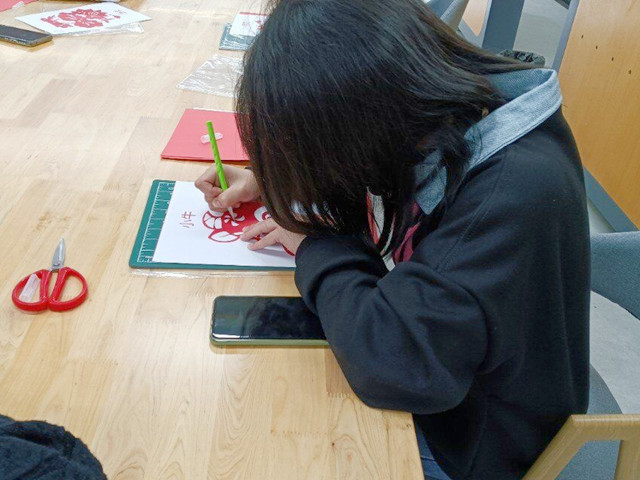 活动那个开始,韩城飞同学对接下来进行的剪纸体验活动进行了简单的讲解。首先将图样和红纸用固体胶把边缘部分固定住,防止在剪的过程中图样和红纸对不齐。然后将其放在垫板上面,防止使用刻刀的时候划到桌子。准备工作做好之后就可以开始刻了,刻的时候要先从图样里面小的白色部分开始刻,再刻大的部分。