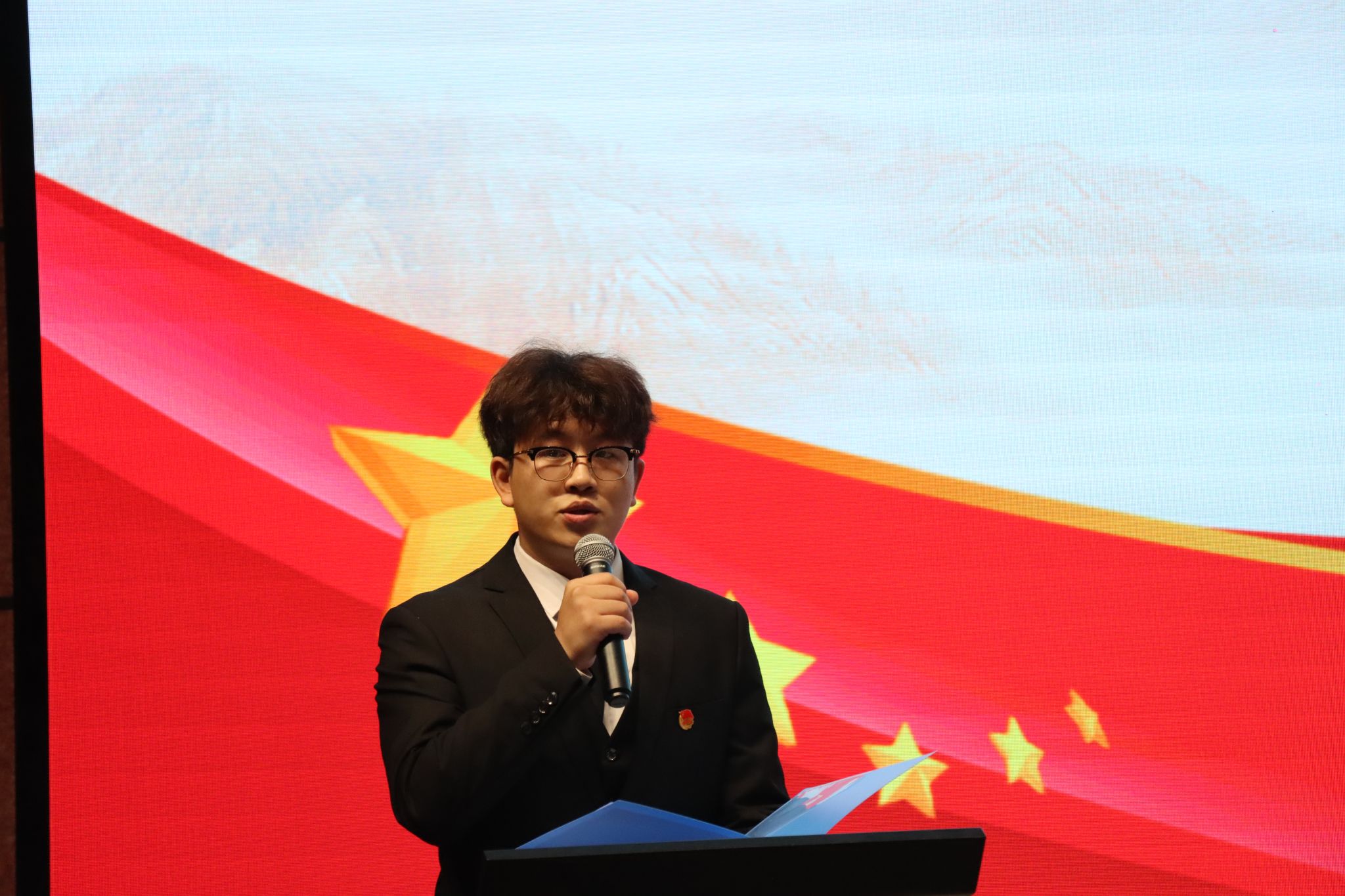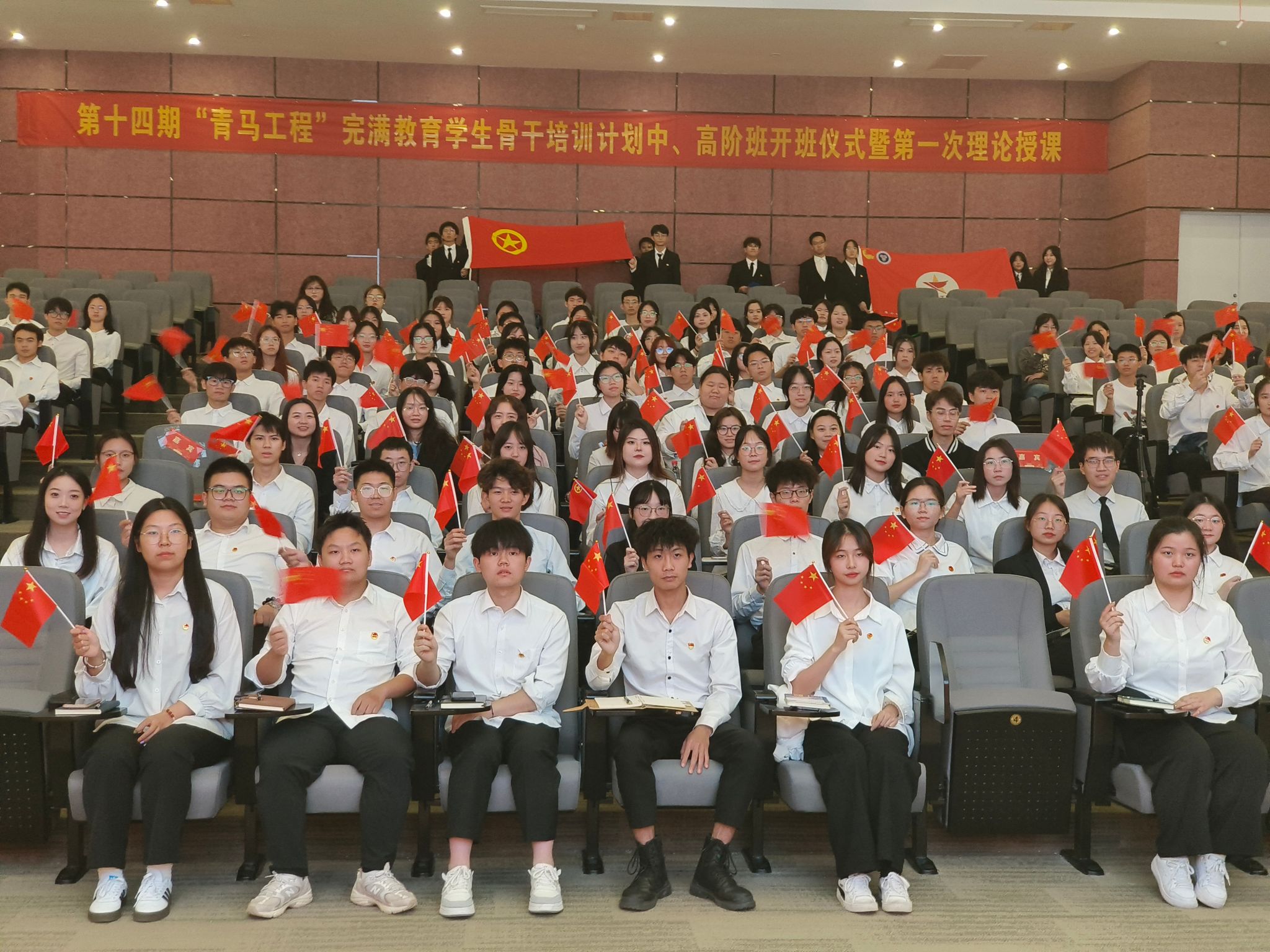 团委后玉良老师为第十四期“青马工程”完满教育学生骨干培养计划全体成员授旗,完骨中阶班学员刘涛代表全体学员接旗。