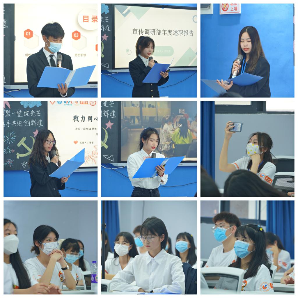 各部门代表依次述职,围绕本学年工作进行总结概述,对工作中取得的成绩进行梳理,面临的问题进行剖析,分享在为期一年的学生工作中的收获与成长,对以后的工作做出思考和规划。淬炼·国际商学院(綦江校区)学生组织的九大部门在指导老师的带领下,打破双校区限制的零基础,踏实做好工作,在学生组织的道路上越走越远。綦江淬炼开展的活动和工作切合实际要求,不断靠拢学生意愿,牢牢把握可行性与创新性,使得其参与面大、受众群体多、教育意义深,这都离不开各位老师的悉心指导、学长学姐的耐心帮助和干事们的辛勤付出。