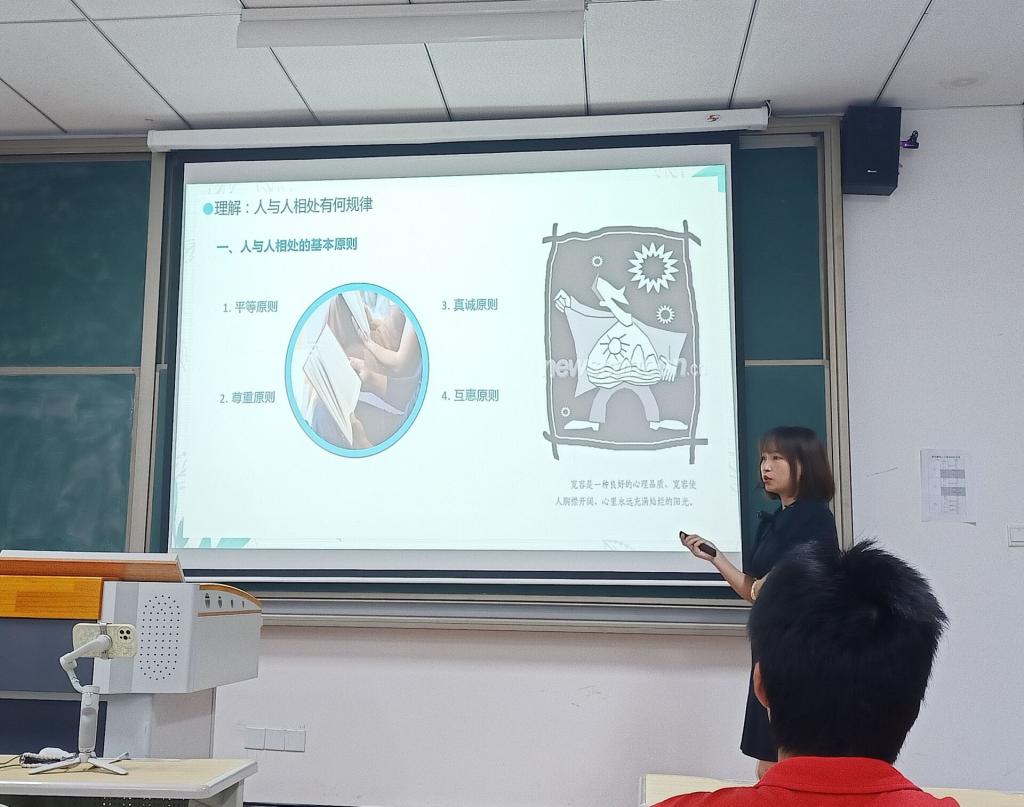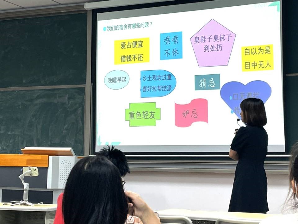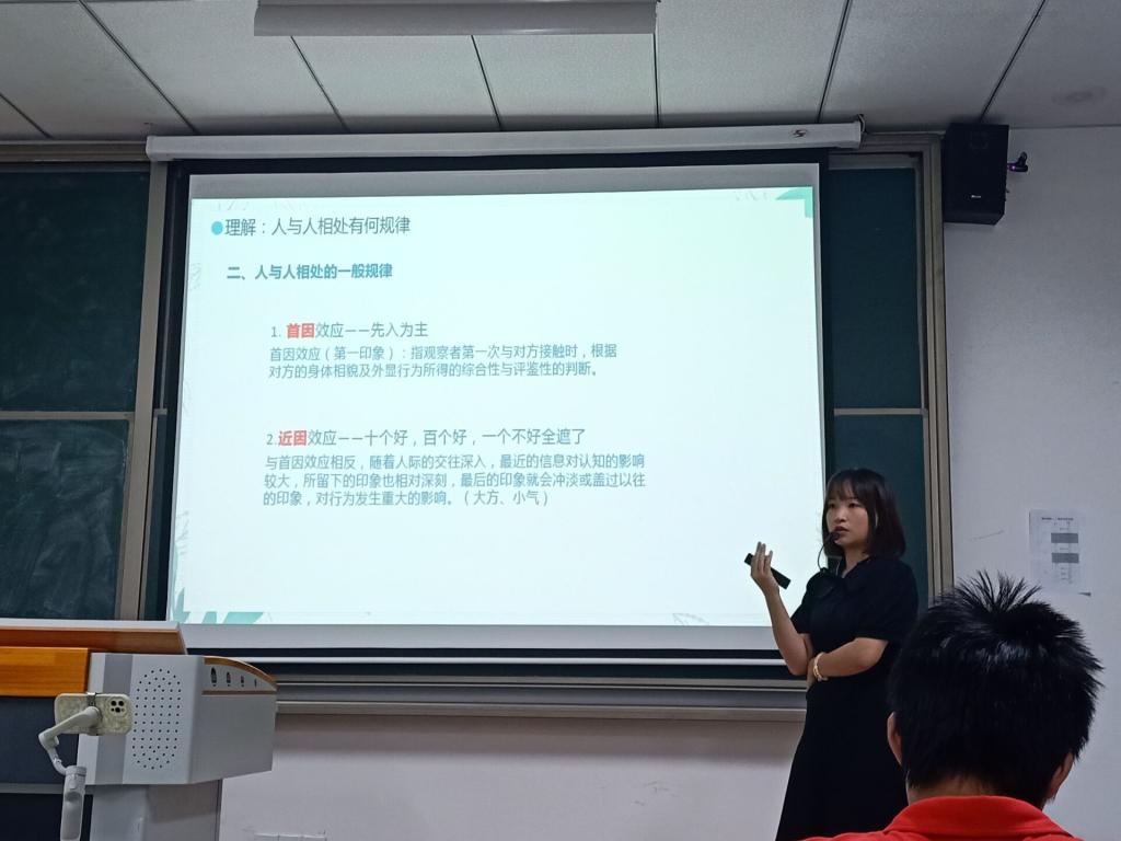 尹老师就如何与室友更好的相处,从两个方面向同学们分析了人与人之间的相处规律。首先,根据人与人相处的基本原则呼吁同学们在人际交往中要坚持平等的原则,尊重他人、真诚待人、互相帮助;其次,在人与人相处的一般规律上,希望同学们要把握首因、近因、晕轮以及投射效应,避免先入为主和以偏概全的概念,不要在不熟悉的情况下快速否定他人,避免在相处中把自己的价值观与情感好恶强加于人,同时,也要努力提升个人人格魅力,以优化他人对自己的第一印象,更容易让他人接纳自己。