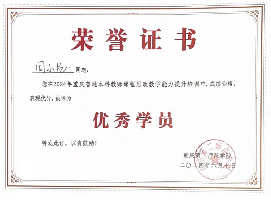 本次培训涵盖了专家讲座、导师工作坊、教师赛课等形式,旨在提升教师在课程思政教学中的理论水平和实践能力。培训过程中,我校教师表现凸出,积极参与讨论交流,同与会专家、导师、学员,共同学习和探索了课程思政教学的新理念、新方法、新路径等。其中周小艳教师获得了“优秀学员”称号。