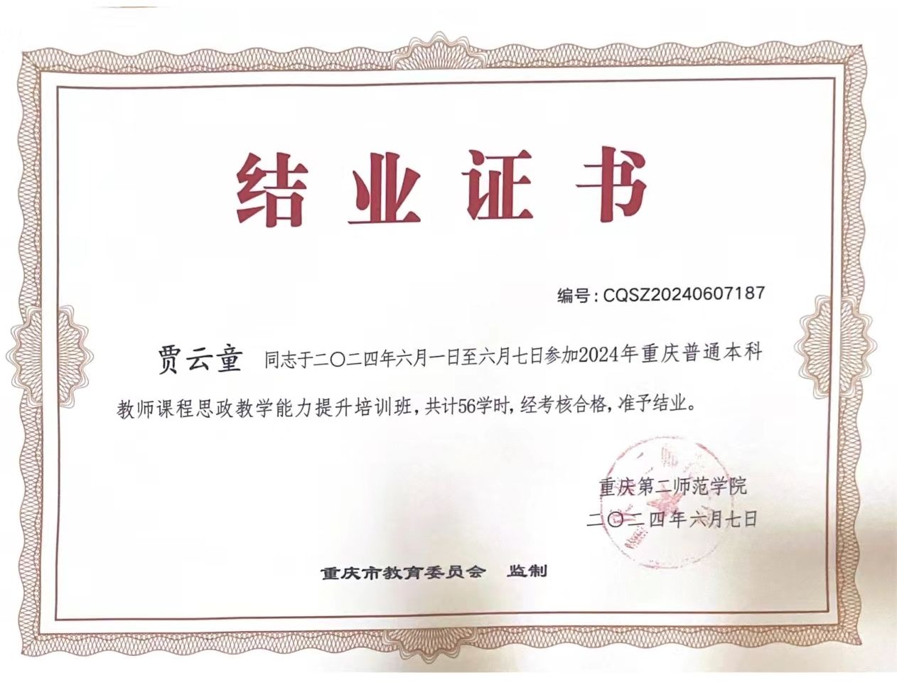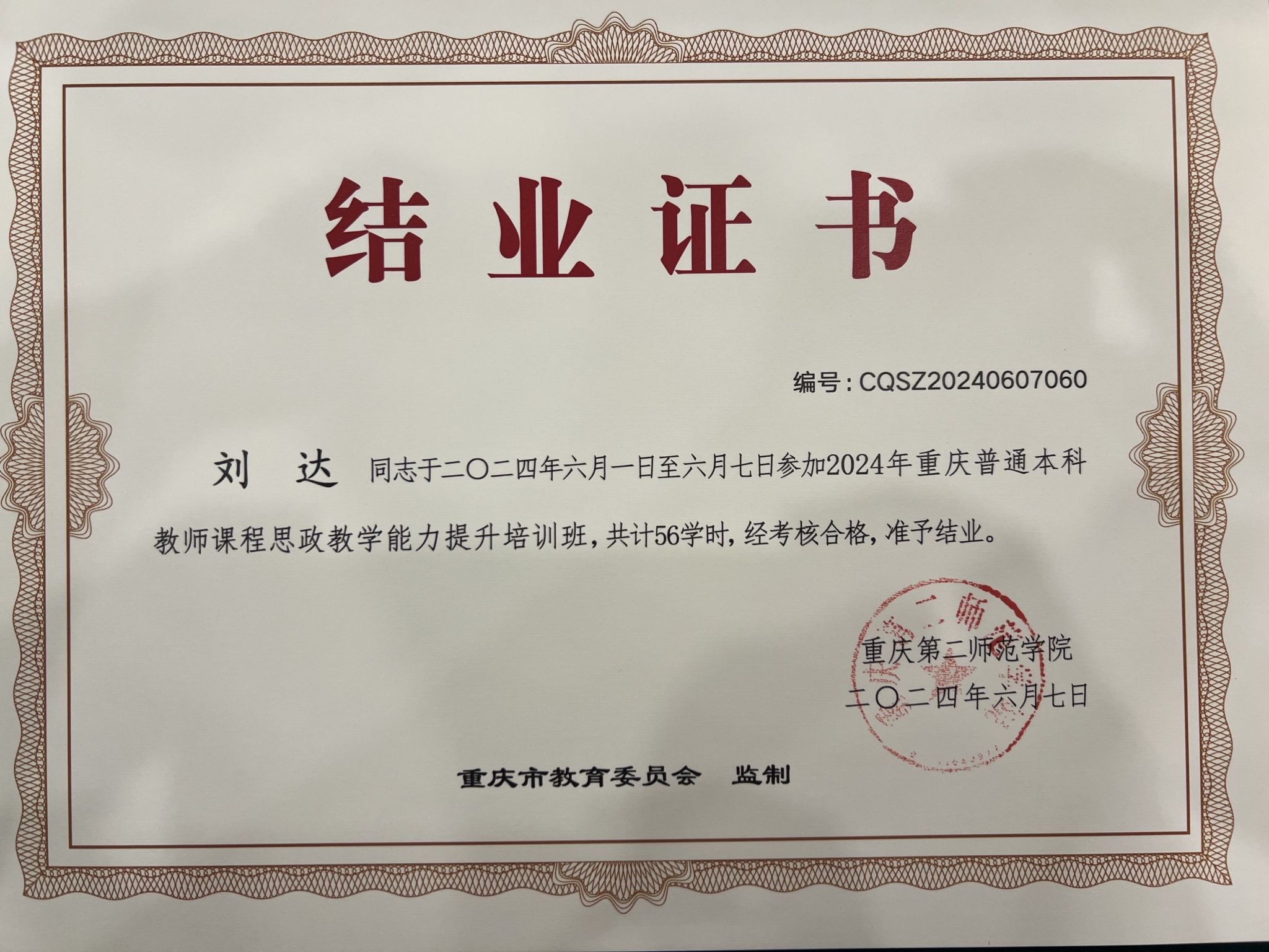 新时代背景下,教育事业迎来了前所未有的机遇与挑战。为深入贯彻党的教育方针,全面落实立德树人根本任务,提升教师课程思政建设能力,2024年6月1日,我校教师代表(闫公博、郑玲玲、周小艳、刘达、贾云童、舒玉红)赴重庆第二师范学院,参加了由重庆市教育委员会主办,为期7天的课程思政教学能力提升培训班。