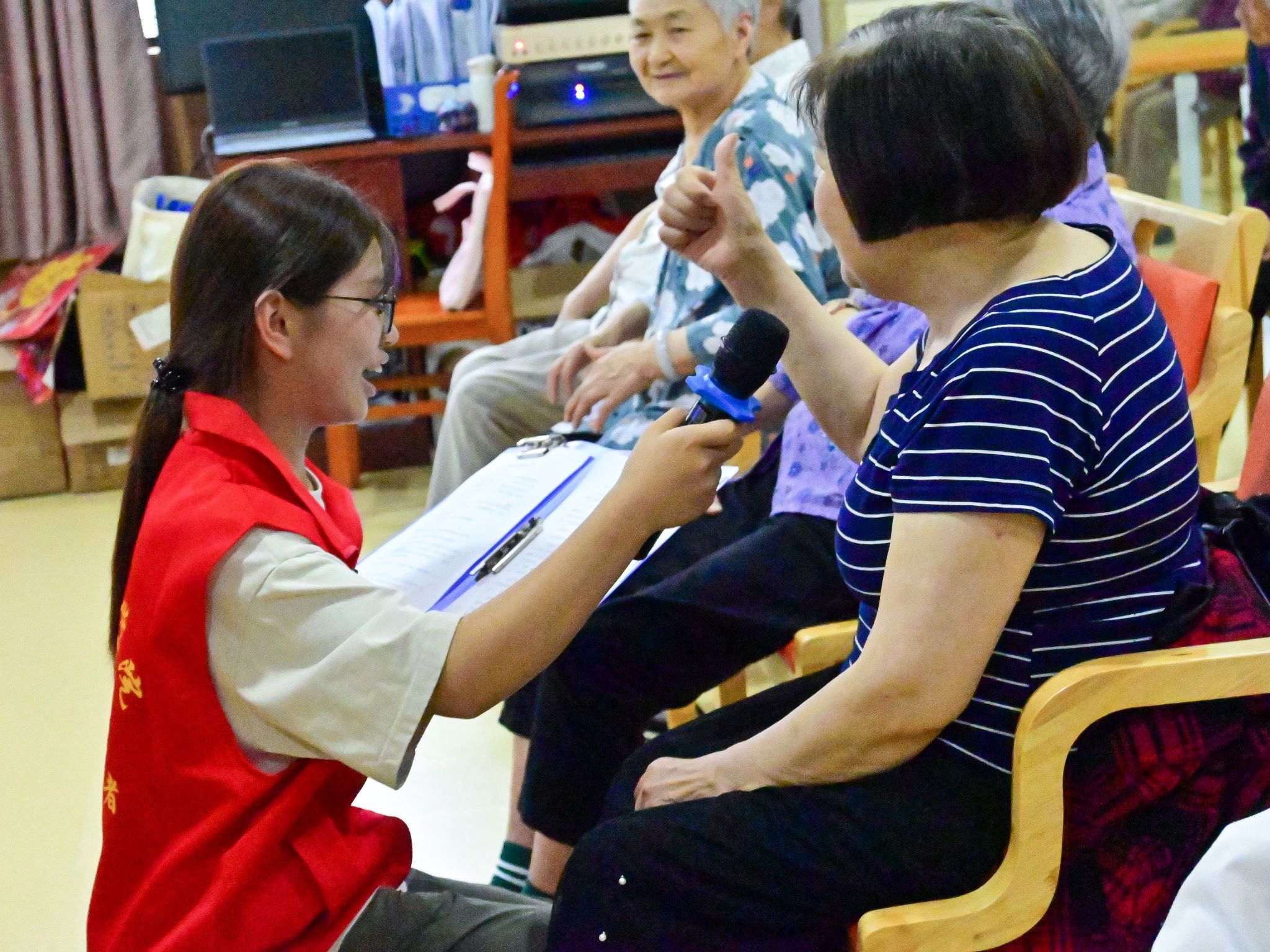 活动正式开始,志愿者用一首《我和我的祖国》拉开活动的序幕,熟悉的旋律让不少老人们跟着一起哼唱起来,现场氛围十分融洽。紧接着,志愿者们用欢快的舞蹈《最炫民族风》,将活动带到高潮,在音乐停止的同时热情邀请活动现场的老人们一起参加听歌传花小游戏,鼓励老人们展示自我,以趣味手工小游戏,锻炼老人们的动手能力,提高与老人们的互动感。活动现场,志愿者们为爷爷奶奶们营造一种家一般的氛围,让他们释放内心的纯真,老人们都洋溢出满意的笑容,在互动中感受到温暖和关怀。
