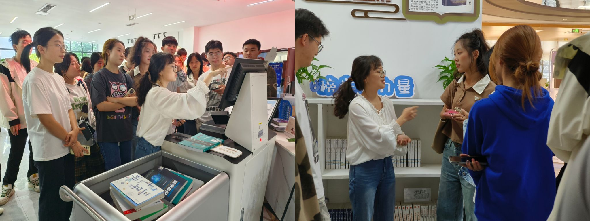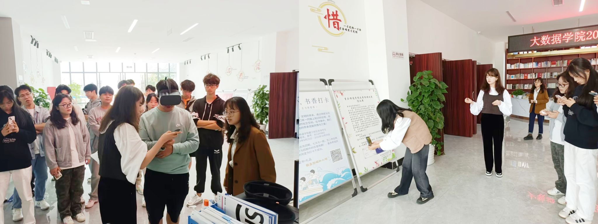 本次接待日活动在轻松欢快地氛围中开始了,图书馆老师为大家讲解演示借还、缴费、借阅记录查询的流程步骤,介绍图书馆的规章制度和台灯的使用须知等内容,介绍图书馆最近线下开展的“共享悦读,书香打卡”活动,虽然活动即将截止,但部分同学还是按捺不住想要参加的心情,纷纷拿出手机扫码加入关注,紧接着老师带大家参观了图书馆不同特色阅览区——大咖阅读区、好书推荐、新商科教育体验中心专区、导师共读区、作家领读区、英语角、期刊室。除了馆藏纸质书籍外,图书馆还有独特的数字资源设备,譬如VR新型阅读、电子图书“瀑布流”等等,萌新们体验完数字资源设备,就可以根据自身需求进行阅读了。