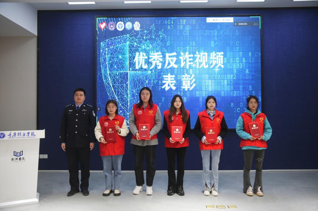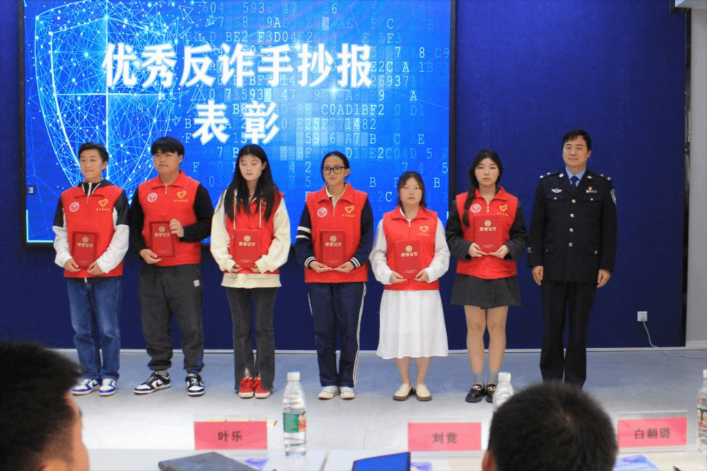 颁奖环节上,反诈中心叶乐副主任、白朝露副所长分别为本次系列活动中优秀反诈视频获奖者、优秀手抄报获奖者颁发荣誉证书,并以此鼓励鼓舞学校师生将反诈宣传工作继续做实做牢。最后,飞鹰反诈宣传志愿服务专项支队代表胡荣欣上台带领在场全体人员作关于坚持全民反诈的宣誓,营造了警民携手、共同防范网络电信诈骗的良好氛围。