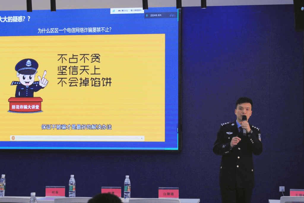 反诈知识讲座上,区公安局反诈中心侦查员叶洪林警官立足各类鲜活的诈骗案例,展示被害人的心路历程和被害经过并一一剖析,深刻揭露不发分子实施诈骗的多种手段以及同学们可以采取的防范对策。随后在现场发起了有奖问答环节并与同学们展开交流互动,告知同学们在日常生活中如何理性冷静的面对诈骗不法分子,如何维护自己的人身及财产安全。