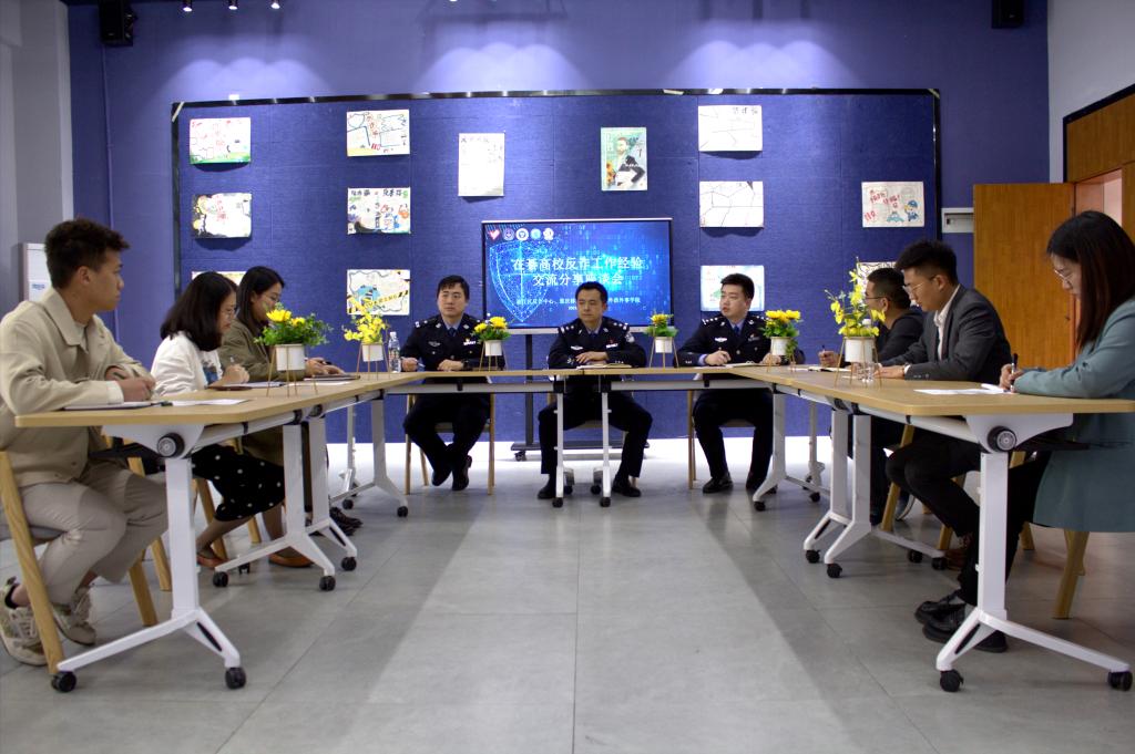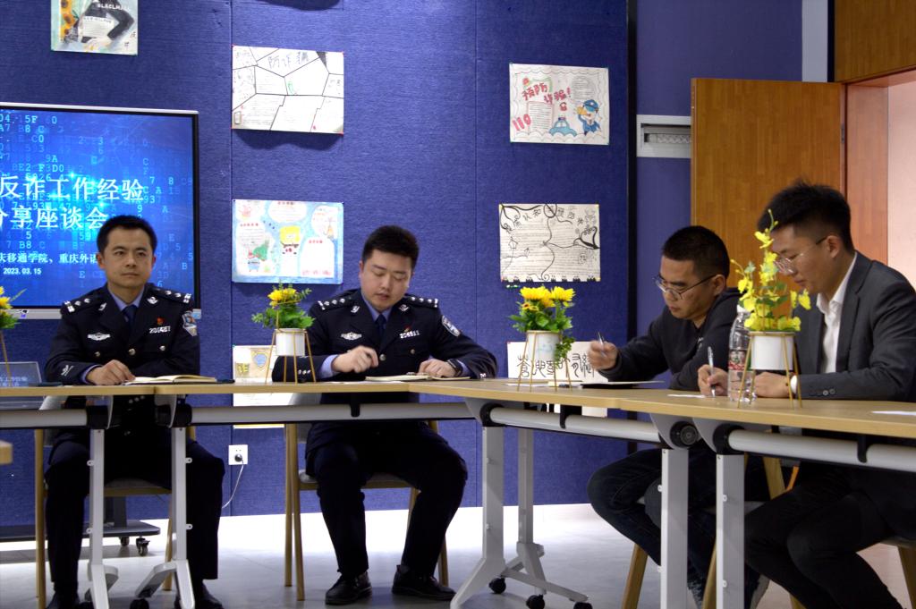与此同时,区反诈中心干警们携重庆移通学院与重庆外事外语学院反诈宣传工作有关师生代表于綦河书院2号楼南渊功能室展开了在綦高校反诈工作经验交流会。此次交流会中,刘竞队长对重庆移通学院反诈工作给予高度肯定,提出要着重加强警校联动,让同学们被动接受反诈宣传为主动参与实施反诈宣传,进一步开发同学们学习反诈知识的意识和动机。两所高校分别就已开展的反诈工作实际和先进的工作经验作出分享,互相学习,取长补短,并就未来联动融合化开展校园反诈宣传工作提出合作意向。