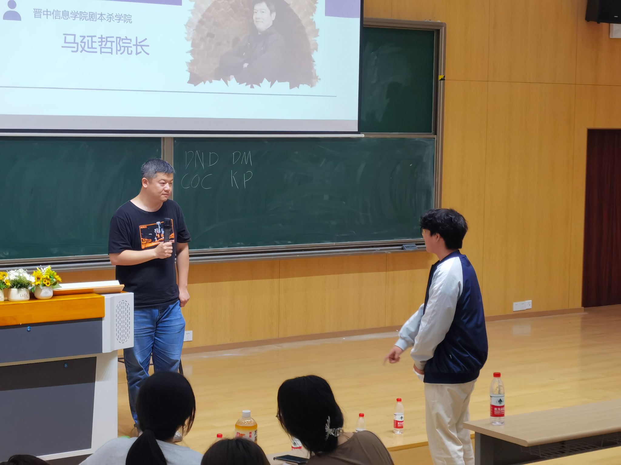 今天马延哲院长莅临我校开展了一堂关于剧本杀的演讲。演讲的内容是剧本杀的起源与核心。