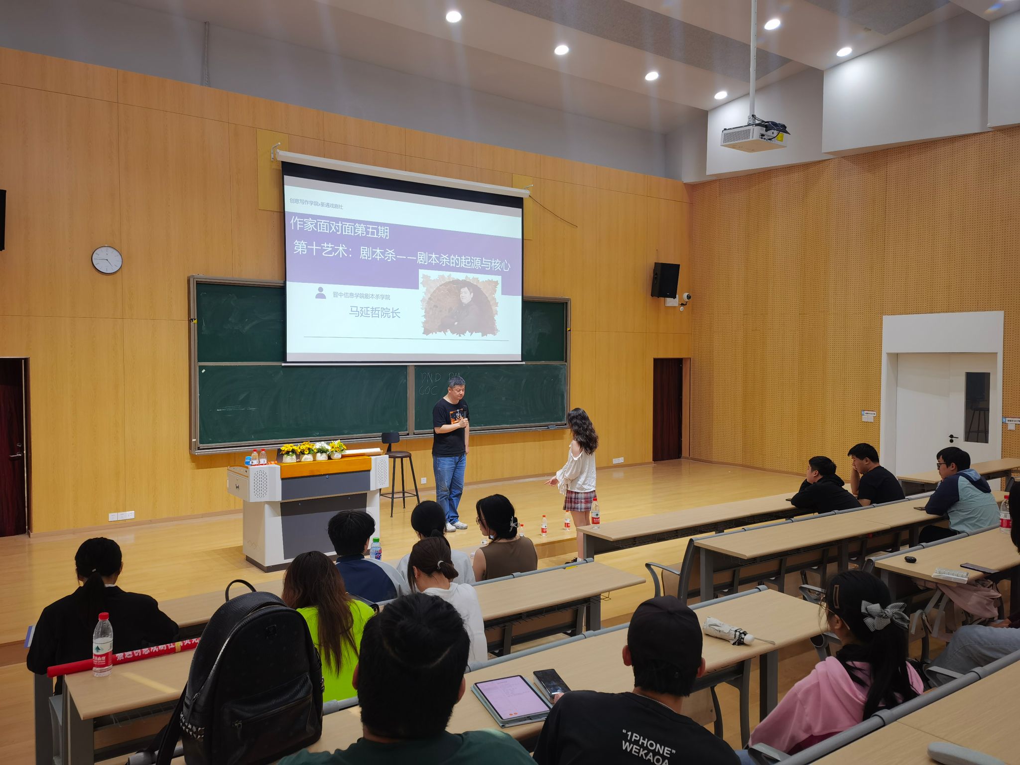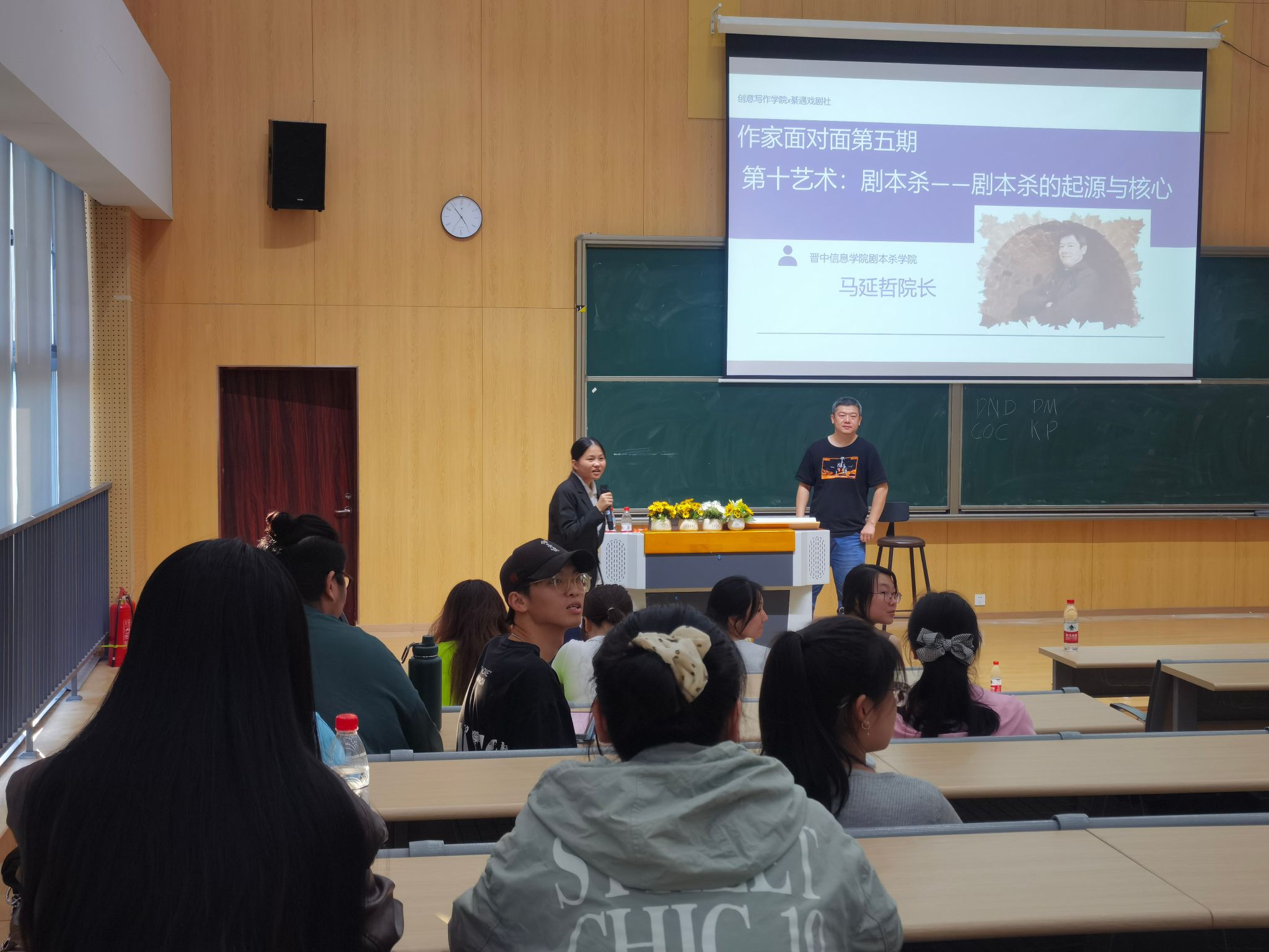 10月17日下午,綦江校区创意写作学院“作家面对面”第5期活动在玉棠书院阶梯教室进行,由著名作家、晋中信息学院云端剧本杀学院马延哲老师来进行《剧本杀——剧本杀的起源与核心》文学讲座。全场与会的同学,都被这场讲座紧紧抓住了,尤其是爱好剧本杀的同学,更是见到了剧本杀界的“真神”马老师而激动。创意写作学院綦遇创意戏剧社承办了这场活动,社长王宏波、副社长王玲,演艺部部长刘毅增等同学多日来一直在工作,指导老师丁一钒、王恒绩全程指导并协调,使得活动取得圆满成功!