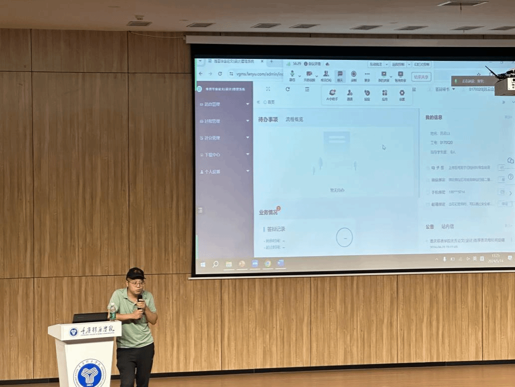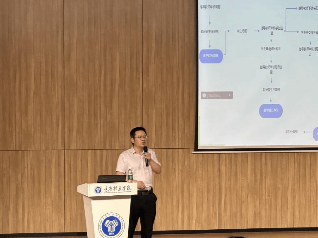 吕云山副院长首先为大家详细讲解了各学院赴合川答辩教师的行程规划及食宿安排,确保每位教师都能顺利、舒适地参与答辩工作。随后,他结合维普毕业论文(设计)管理系统,为教师们梳理了毕业论文的整体工作流程,并强调了要按时完成各项任务,确保毕业论文工作的有序推进。在答辩流程及后续材料收集方面,吕院长也进行了详尽的说明,并对教师们提出的疑问进行了耐心解答,帮助教师们为即将到来的答辩工作做好充分准备。