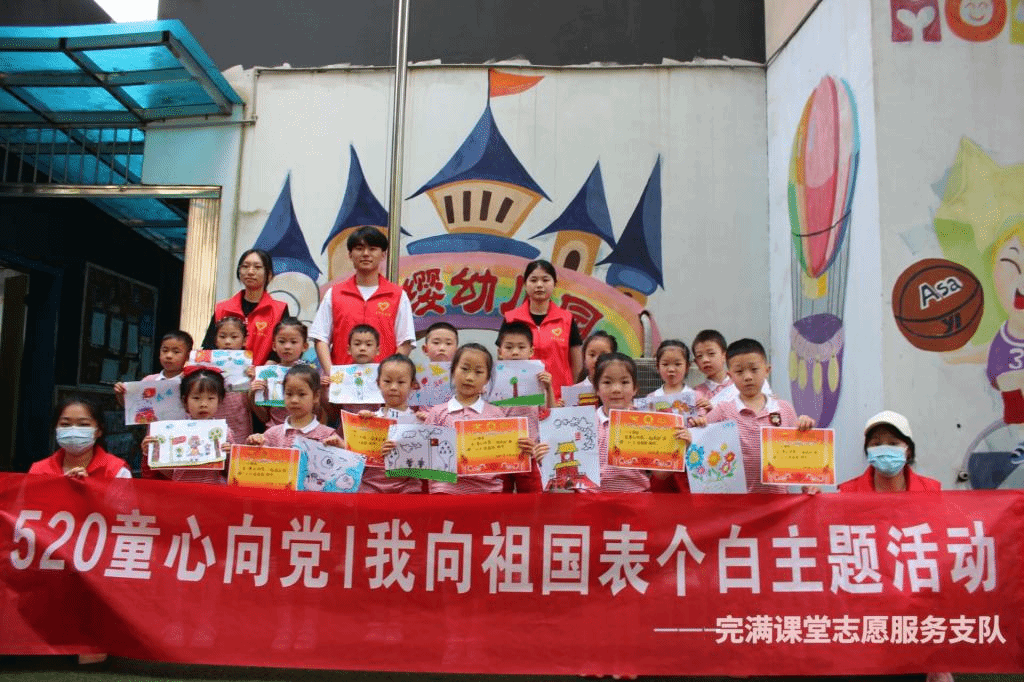 五月,我们欢庆过劳动者的汗水,纪念过青春沸腾的历史,回味过温馨淳淳的母爱。也在不知不觉中迎来了5月20日,它不仅是恋人浪漫表白的日子,也是勇敢的向身边事物大胆说爱的日子。同时,这一天也可以向祖国、向党表达赤忱而热烈的爱。为深入学习贯彻党的十八大精神、增强时代新生er的爱党爱国热情,完满课堂志愿服务专项支队的五名志愿者于5月20日前往心连心社区红缨幼儿园与15名小朋友开展了本次520专项志愿活动。此次活动符合防疫要求与规范。