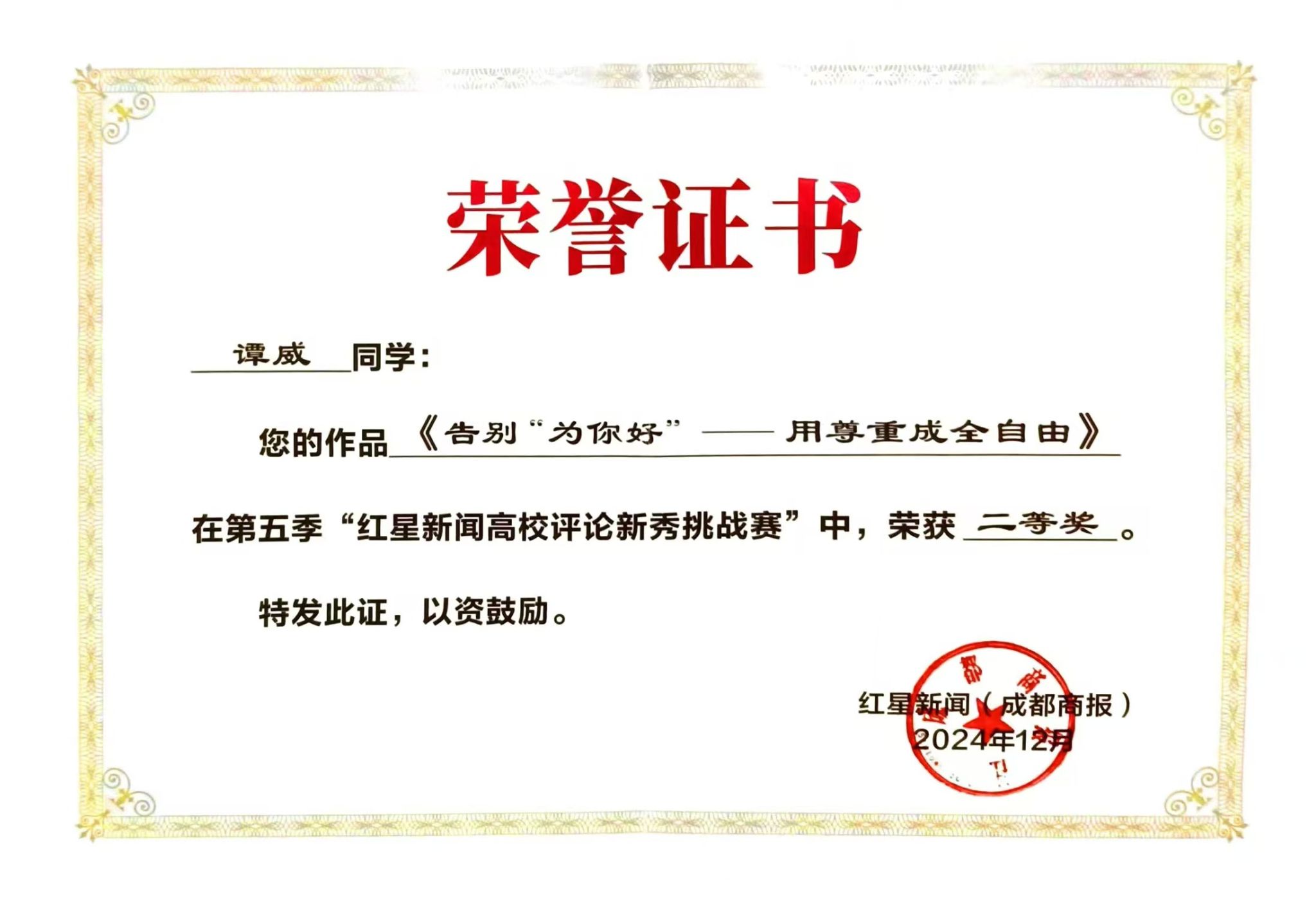 12月,新闻采写产业学院在各类大赛中频频获奖。在刚刚结束第五季红星新闻高校评论新秀挑战赛上,新闻采写产业学院綦江校区的学生谭威表现突出,在郝树静老师的指导下,创作的新闻评论作品《告别“为你好”——用尊重成全自由》,以独特的视角和深入的剖析赢得了评委的高度认可,最终以271分的优异成绩荣获第二名,获得全国二等奖。