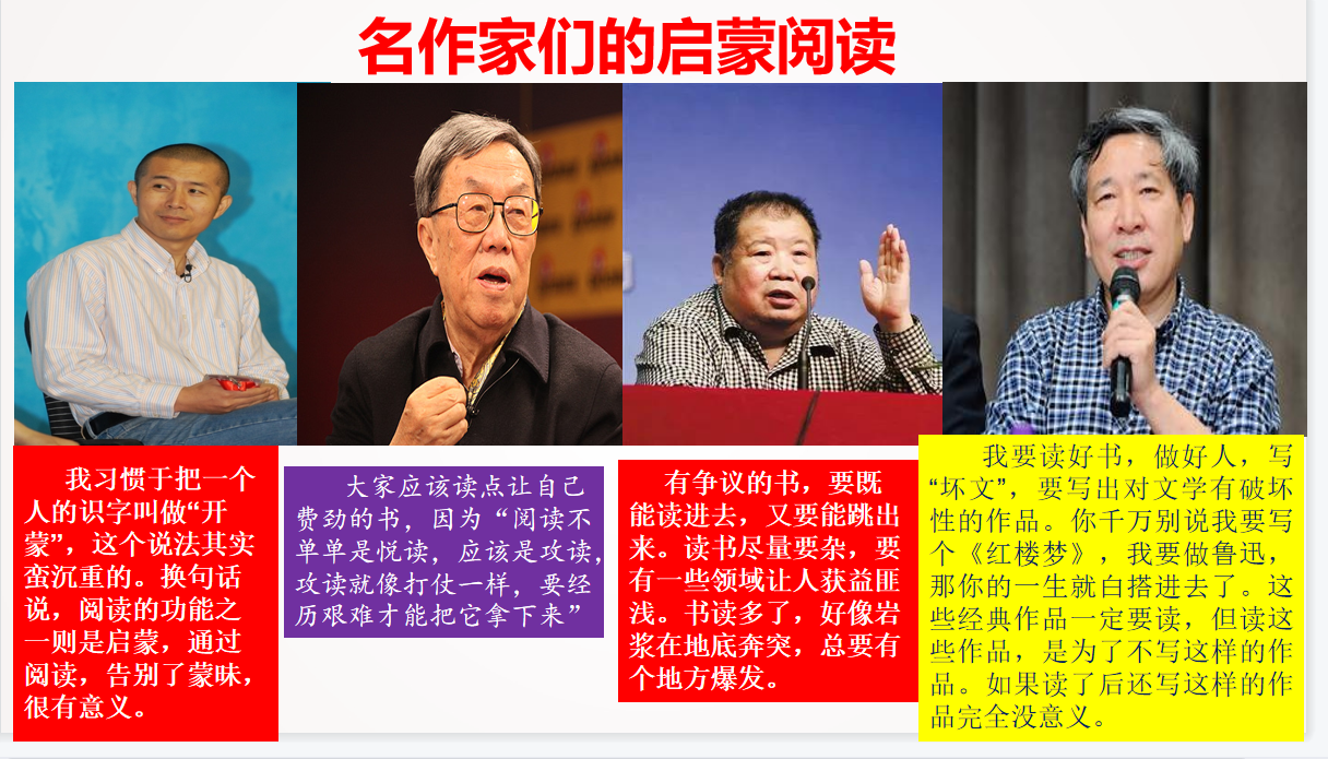 也有的同学,会在看完一本书或者看完一部电影后,马上迸发出创作的冲动,还有的同学在恋爱或者失恋后,都有强烈的创作冲动,同学们听到这里都笑了,说的就是你的曾经么?然后王老师精挑细选了一些名家对于阅读的看法,毕飞宇谈“启蒙”,王蒙说“攻读”,二月河讲“杂读”,阎连科追求“破坏性作品”,林清玄说“文学让生活变得浪漫”。王老师激动地说道,大家之所以成为大家,是因为阅读奠基,为什么有些人可以出口成章,也是因为阅读提供了文学养分……