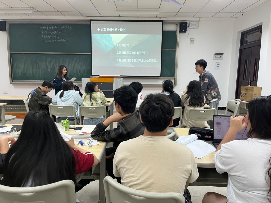 接下来就是对许真同学的作品《暗纹》的研讨,各组同学在经过十几分钟的激烈讨论后派出了代表上台陈述自己小组的意见。李晓洁组提出了让小说可以不用《平原上的摩西》的写作手法,就以主人公李青云为主线来写。韦爱莲小组提出了对小说主题的理解:“原生家庭对人的影响”,也注意到文中暂时还没有呈现和“暗纹”相关的内容。廖大凯小组总结出了文章的很多小缺点,比如:“小说前半部分有悬念设置,语言凝练,但后面看上去又像一个网文,叙述拖沓。”并对这个小说提出了很多实质性的建议,比如:“人称的转化非常突兀,缺乏延续性。”等等。