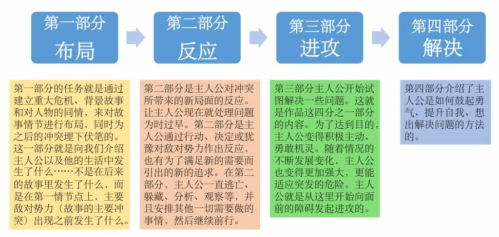 苏老师首先将四步法内容的PPT展示在我们面前,介绍了四步法分别有布局、反应、进攻、解决,然后和戏剧的三幕剧进行了比较,告诉同学们:“小说模式势必要比戏剧模式缓慢一些,毕竟是一种文字描述。”这让同学们能够更好分辨两种结构,接着就让同学们阅读和理解四步法的基本内容。
