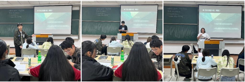在课堂开始时,苏瓷瓷老师询问了同学们上一节课学了什么内容。同学们开始回忆起来:“学了小说结构的种类,有线性结构……”随后苏老师进行了补充:“小说的结构比较常用的是线性结构,除此外,还有网状结构、画面结构、象征结构、散文结构。”由于画面结构和象征结构较为抽象,苏老师便例举了卡夫卡有象征意义的小说作品《审判》《城堡》,使同学们对把人物精神困境转化为象征的结构类型认识更加深入,对上节课学习的内容也有了全面的回顾。