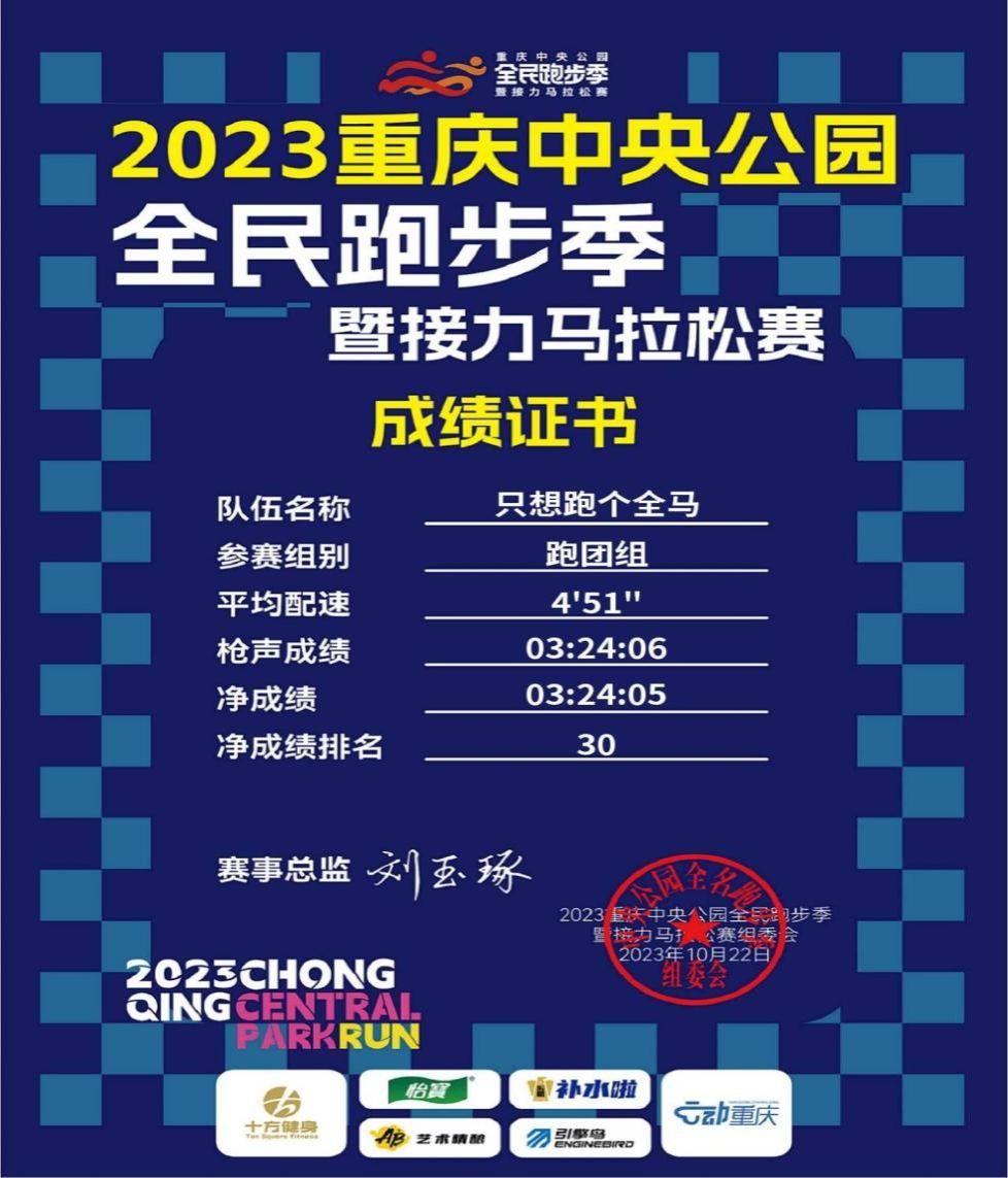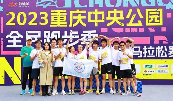 虽然重庆中央公园空气清新怡人,但是赛道的坡度有明显的差别,赛道的障碍也给队员们造成了压力,所以经过小队内部讨论过后,社团成员们提前到达场地熟悉路线,通过合理分析,队员们决定采用前期下坡快,后期上坡稳住配速的策略。虽然队员们在比赛过程中都十分疲惫,汗水滴落,蒙住了双眼,酸胀的四肢也使不上力,但队员们都咬牙坚持,全力以赴,直到比赛胜利完成的那一刻。最终队伍“只想跑个全马”以3:24:06的成绩顺利完成比赛,在98个参赛队伍中排名第30位。