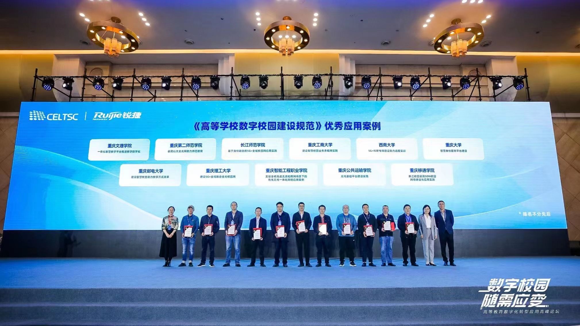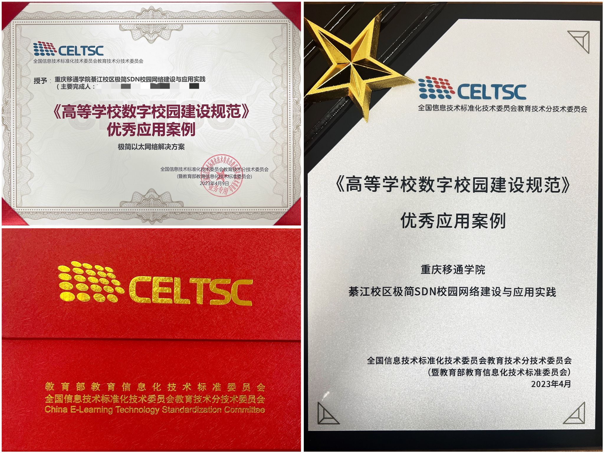 全国信息技术标准化技术委员会教育技术分技术委员会(CELTSC,下文简称“标委会”)于2023年4月9日,在重庆国际会议展览中心召开了“数字校园、随需应变—高等教育数字化转型应用高峰论坛”。面向全国高等院校,评选出41所高校优秀案例。重庆移通学院申报的“綦江校区极简SDN校园网络建设与应用实践”全光以太网络解决方案,获得标委会专家委员们的认可,并授予《高等学校数字校园建设规范》优秀应用案例。