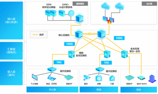 重庆移通学院以綦江校区为试点区域,建成基于全光SDN以太网的基础架构,形成了两校区间的基础网络改造方案和新校区的建设实施方案。有效解决高校校园网建设中传统以太网业务扩展性弱,新业务上线复杂、建设周期长,以及弱电设备多造成的维护复杂等问题。在教学、办公和宿舍场景多角度满足高校的需求;全面保障校园网的终端安全、内网安全和出口安全;让校园网的运维更省心,实现SDN全网管控,统一运维,网随人动。