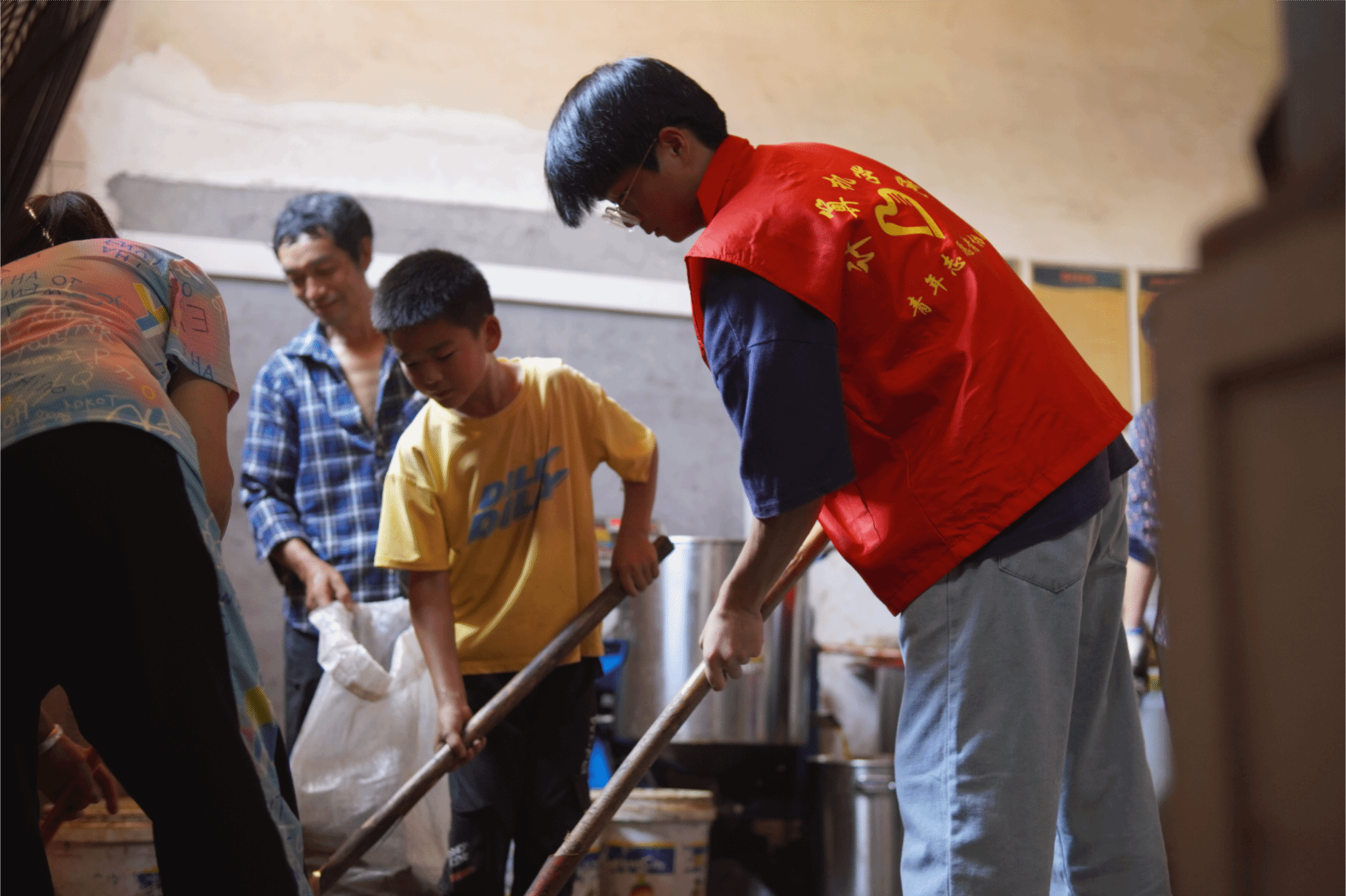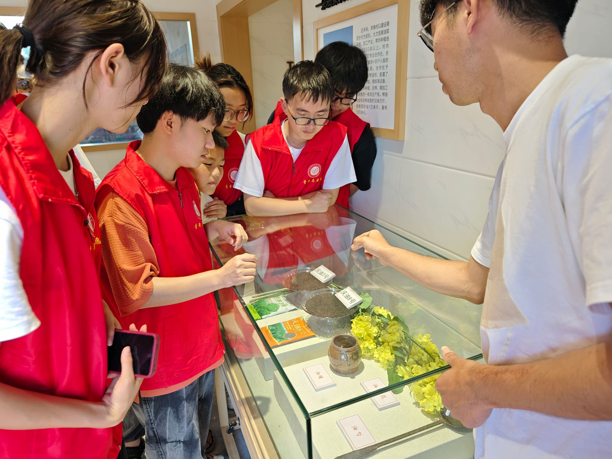而今,当团队踏入羊角村菜籽油加工厂的大门,那股浓郁的菜籽油香气不仅是大自然最质朴的欢迎礼,也是这片土地历经沧桑、依旧生机盎然的见证。在这片既承载着革命历史又孕育着现代农业发展的土地上,孩子们的好奇心被彻底点燃。团队特邀驻村干部徐盛作为知识的引路人,不仅为孩子和志愿者们讲述了羊角村油菜产业的辉煌历程,更巧妙地将这段绿色产业的发展与羊角村深厚的红色历史相融合。他的话语中,既有对油菜从种植到榨油全过程的生动描绘,也有对革命先辈在这片土地上奋斗身影的深情追忆,让他们在聆听中感受到了那份为了国家与民族未来而不懈努力的坚定信念。