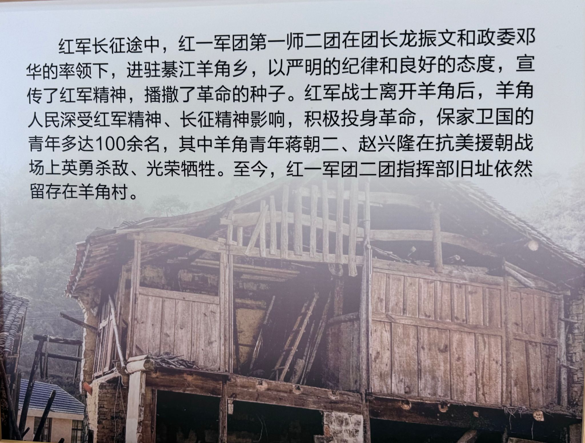 回望历史长河,红军长征途中,红一军团第一师二团在团长龙振文和政委邓华的率领下,曾进驻綦江羊角乡。他们以严明的纪律和良好的态度,向当地人民宣传了红军精神,播撒了革命的种子。红军战士的英勇事迹与高尚品德,如同春雨般滋润了羊角这片土地,激发了当地人民的爱国情怀与革命热情。在红军离开后,羊角人民深受红军精神、长征精神的影响,积极投身革命,保家卫国的青年多达100余名,其中羊角青年蒋朝二、赵兴隆更是在抗美援朝战场上英勇杀敌、光荣牺牲,他们的名字和事迹永远镌刻在羊角村的历史丰碑上。