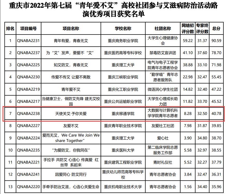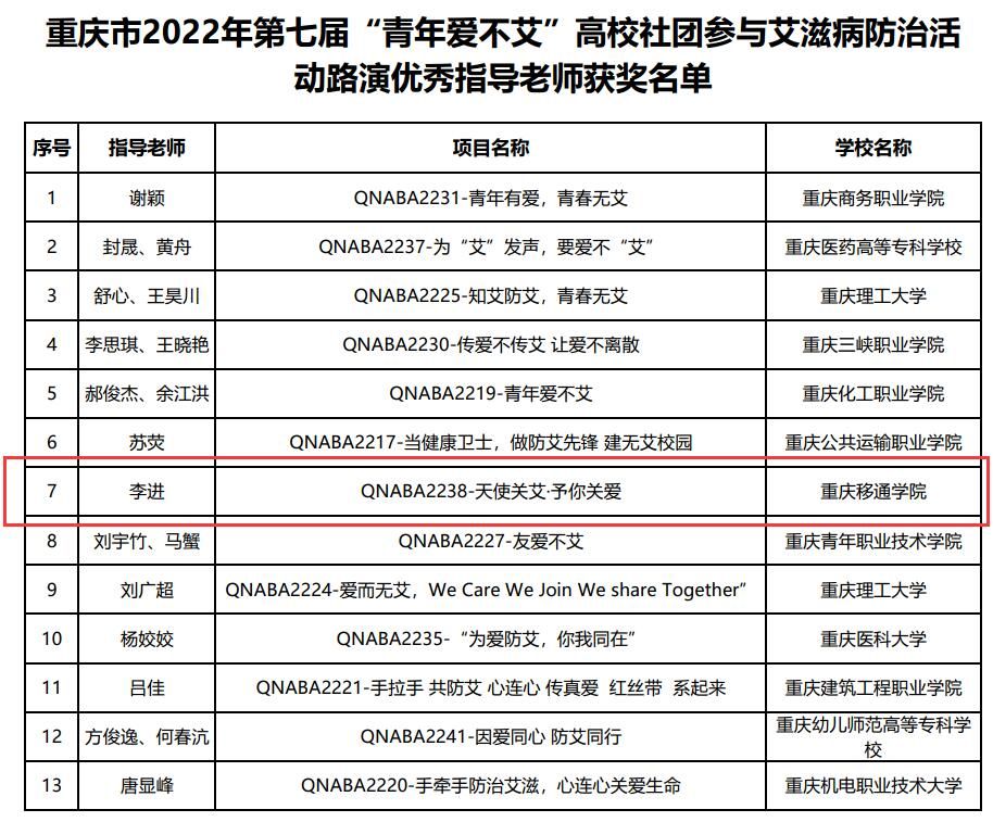 近日,重庆市卫生健康委员会、重庆市健康教育所发布了《重庆市2022年第七届“青年爱不艾”项目路演优秀项目与优秀指导老师获奖名单》。我校大数据学院天使关“艾”志愿服务专项支队组织开展的《天使关艾·予你关爱》艾滋病防治活动路演入选优秀项目,李进老师获优秀指导老师称号。