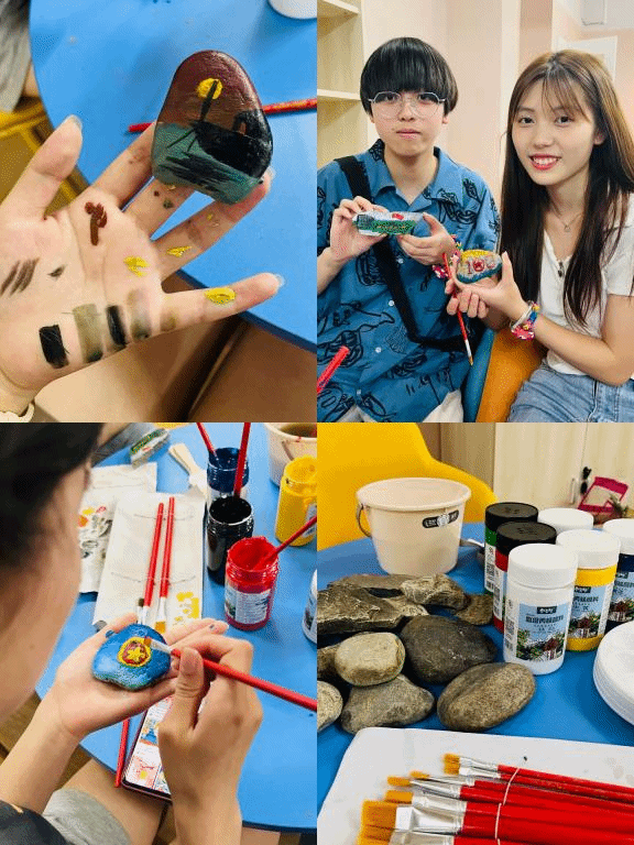 活动现场设有绘画、书法两个区域,社服的同学早早就准备好了颜料、石头、画笔、书写纸等等一系列道具,布置好现场,只为同学们有更好的体验。以指尖书写和绘画来承载自己的情感,活动开始,同学们都显得有些迫不及待,对于自己的创作已经有了灵感,“下笔如有神”。