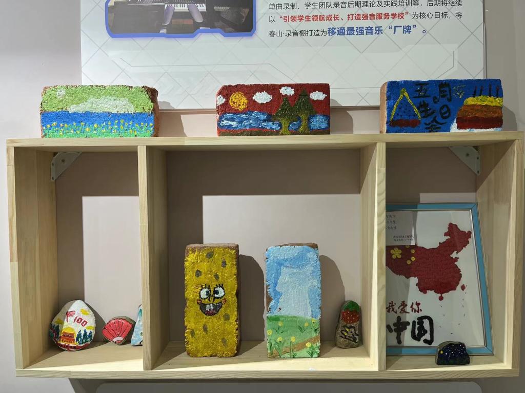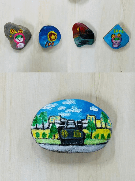 冰冷灰青的石头,看起来索然无味。但当它们在同学们的手下妙笔生花,开始迸发了勃勃生机。五彩斑斓的颜色以及所创造的意境为这些石头增添生机与美感的同时,将对祖国的热爱描绘在石头上,展示了如磐石般坚固的忠诚,代表着红色精神的红船,象征着革命火种和光明的煤油灯,熠熠生辉的党徽和团徽、共青团的吉祥物团宝……一方小小的石头上活灵活现的红色主题跃然而生,寓意对党的忠诚坚定而又坚实。