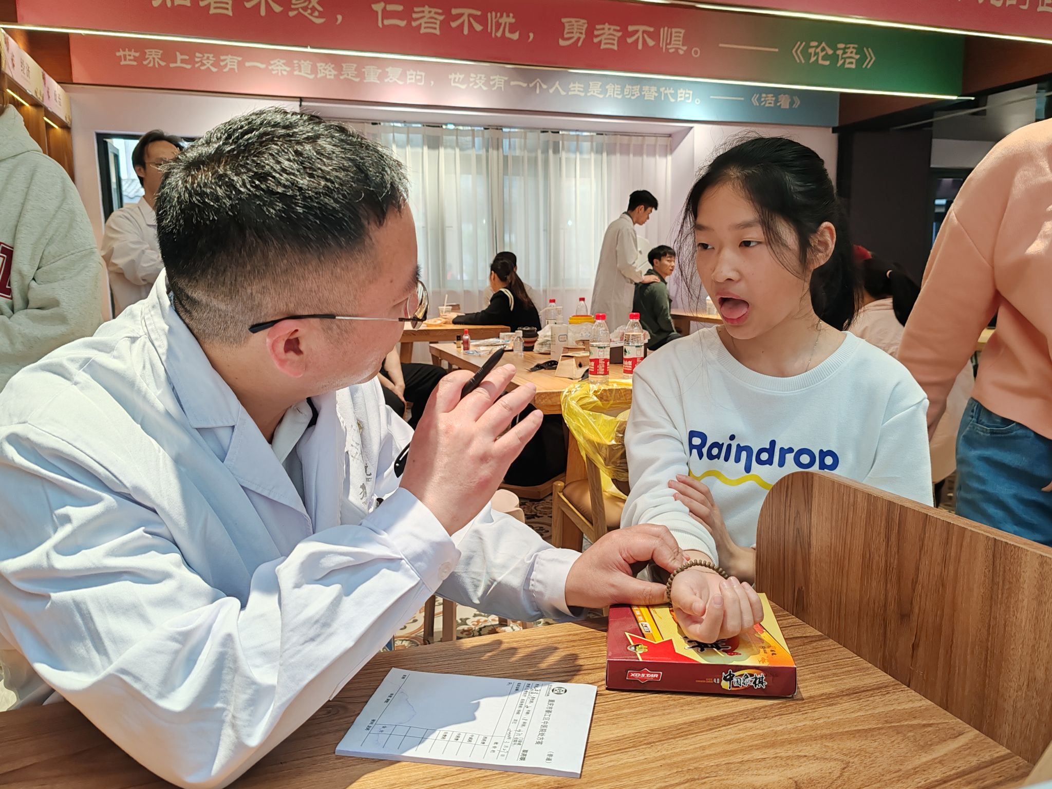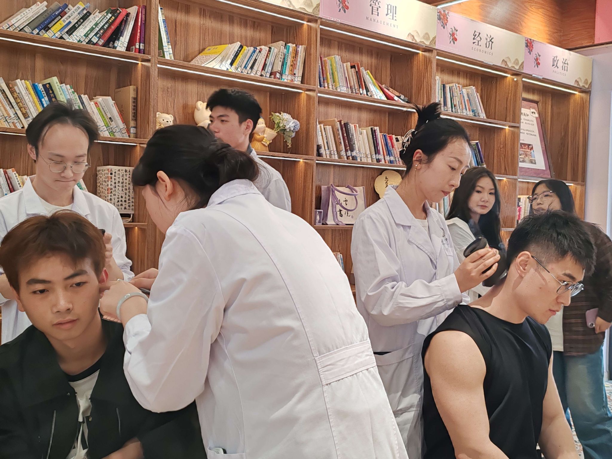 在针灸体验区,现场的医师们针对年轻人们之间常见的失眠、脱发、焦虑等亚健康问题进行诊疗,并为每一个同学都对症开了药方,同时搭配针灸的理疗项目。通过义诊服务,同学们在医生的讲解下更好地了解自己的身体状况,及时发现体内的问题,并采取相应的调养措施。