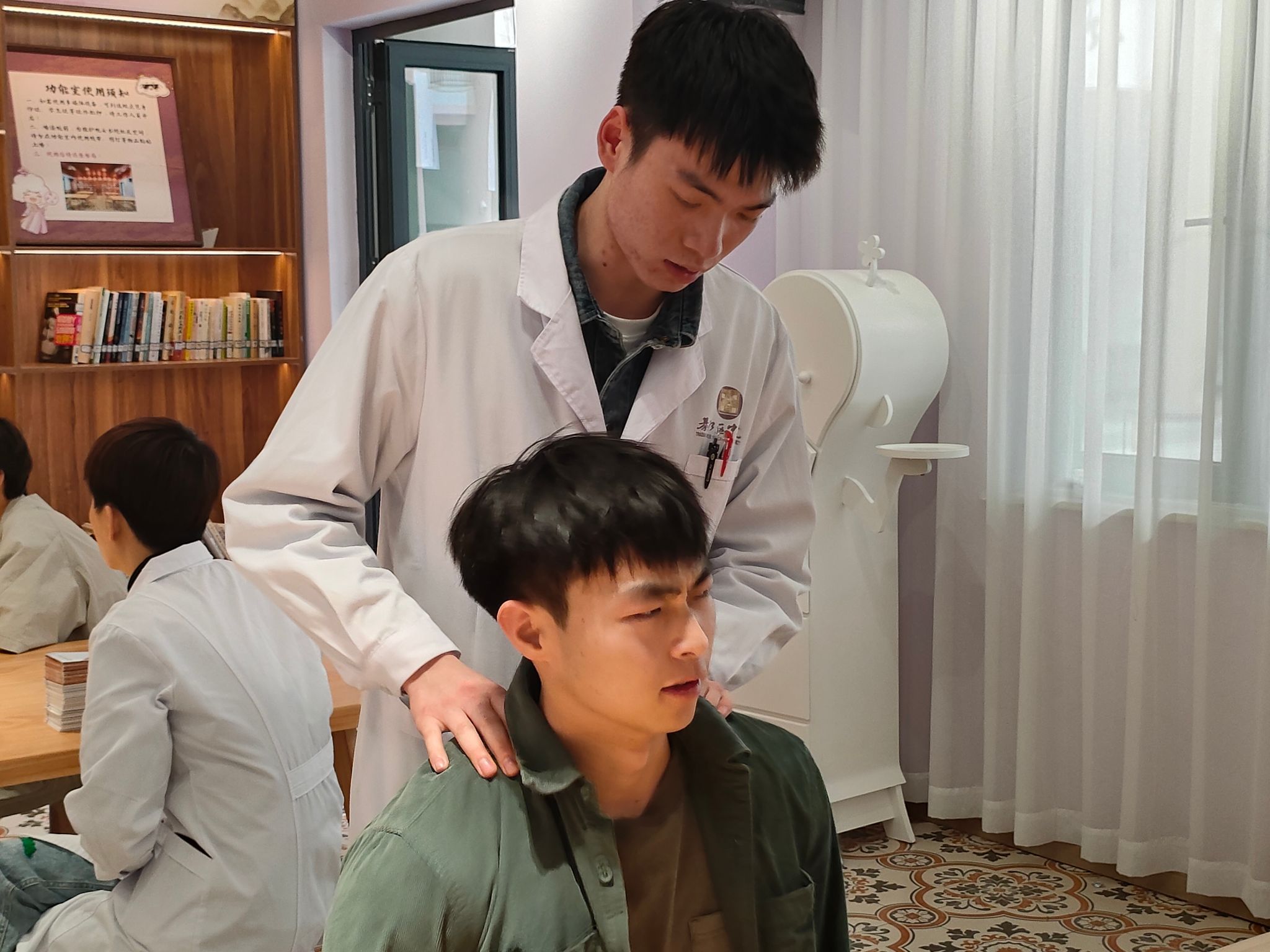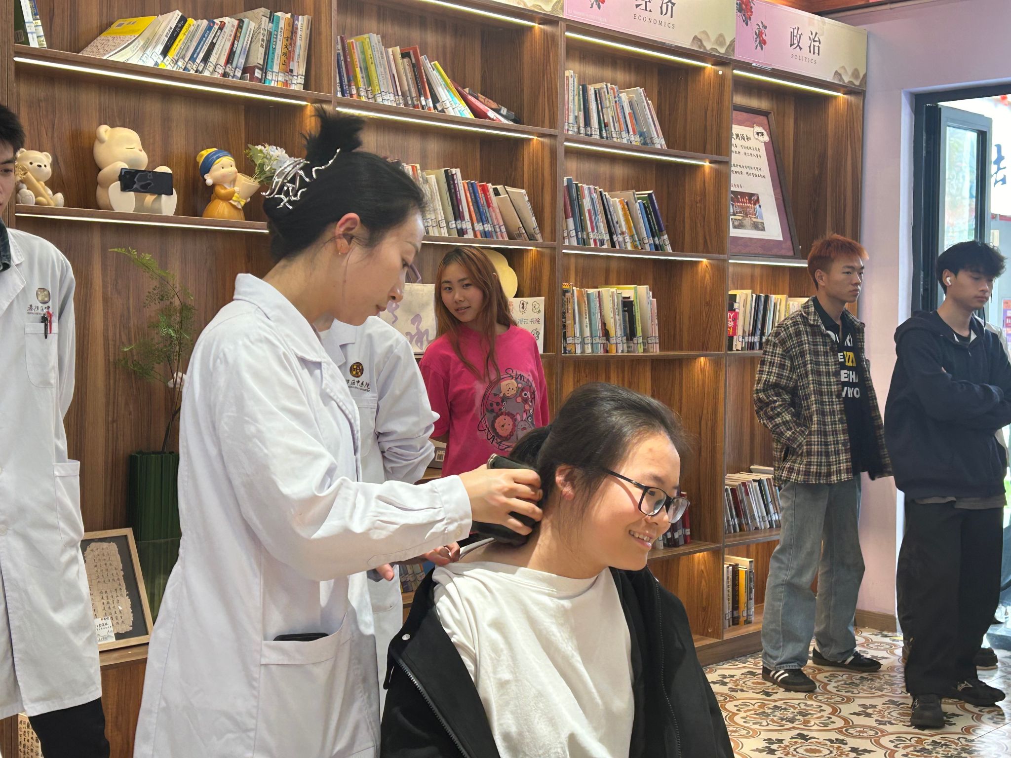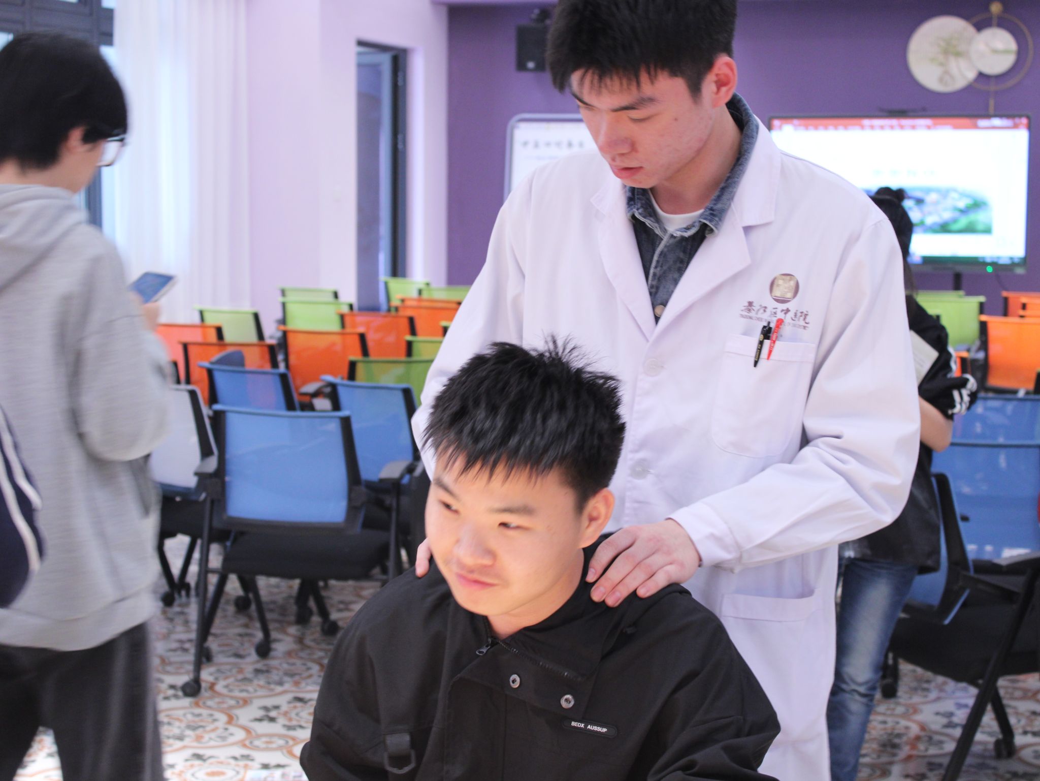 与此同时,中医体验课除了讲座内容,还设置了带有中医特色的理疗体验区。同学们可以参与体验区,亲身体验中医针灸、推拿、刮痧等特色诊疗的神奇魅力。