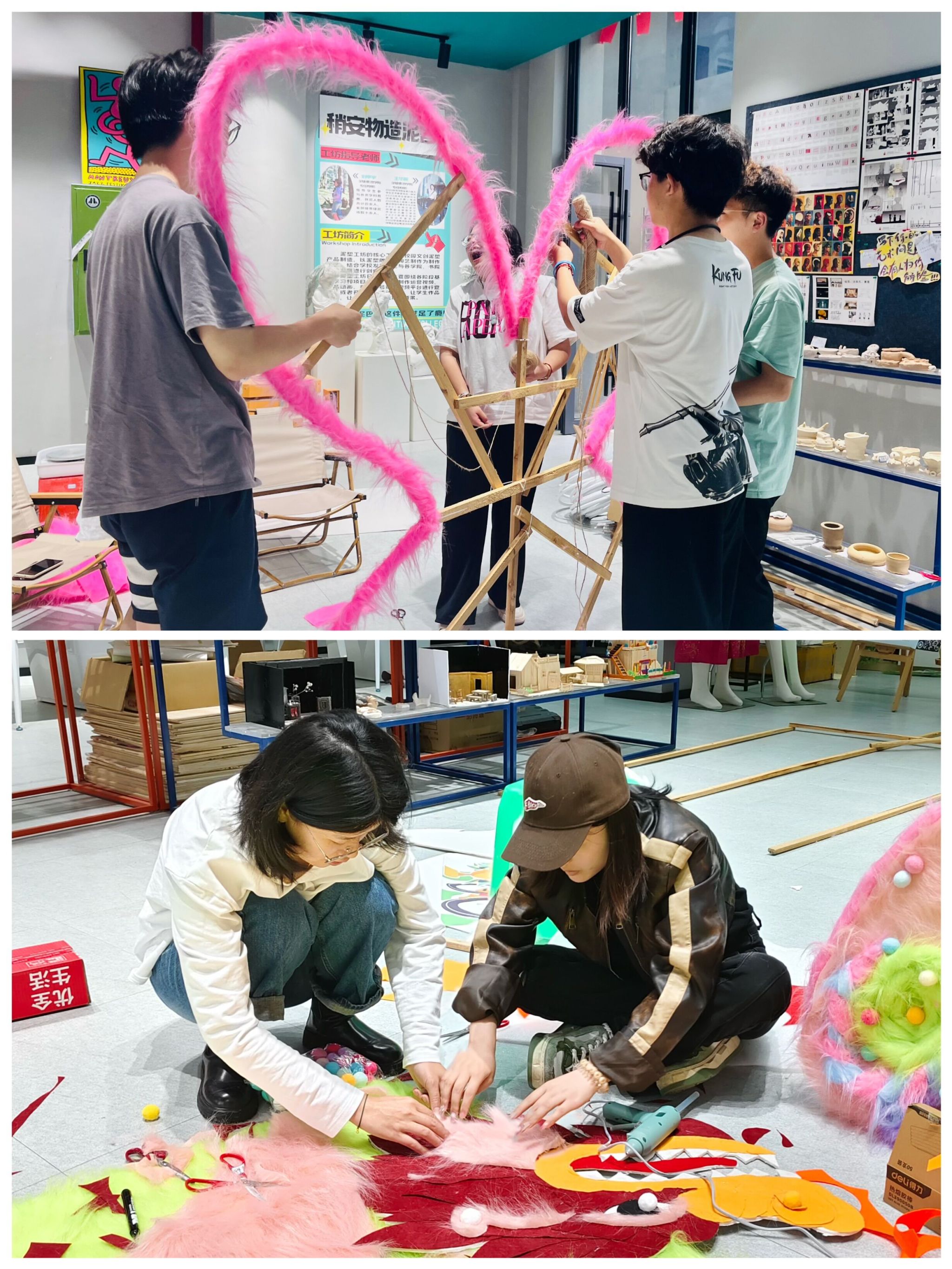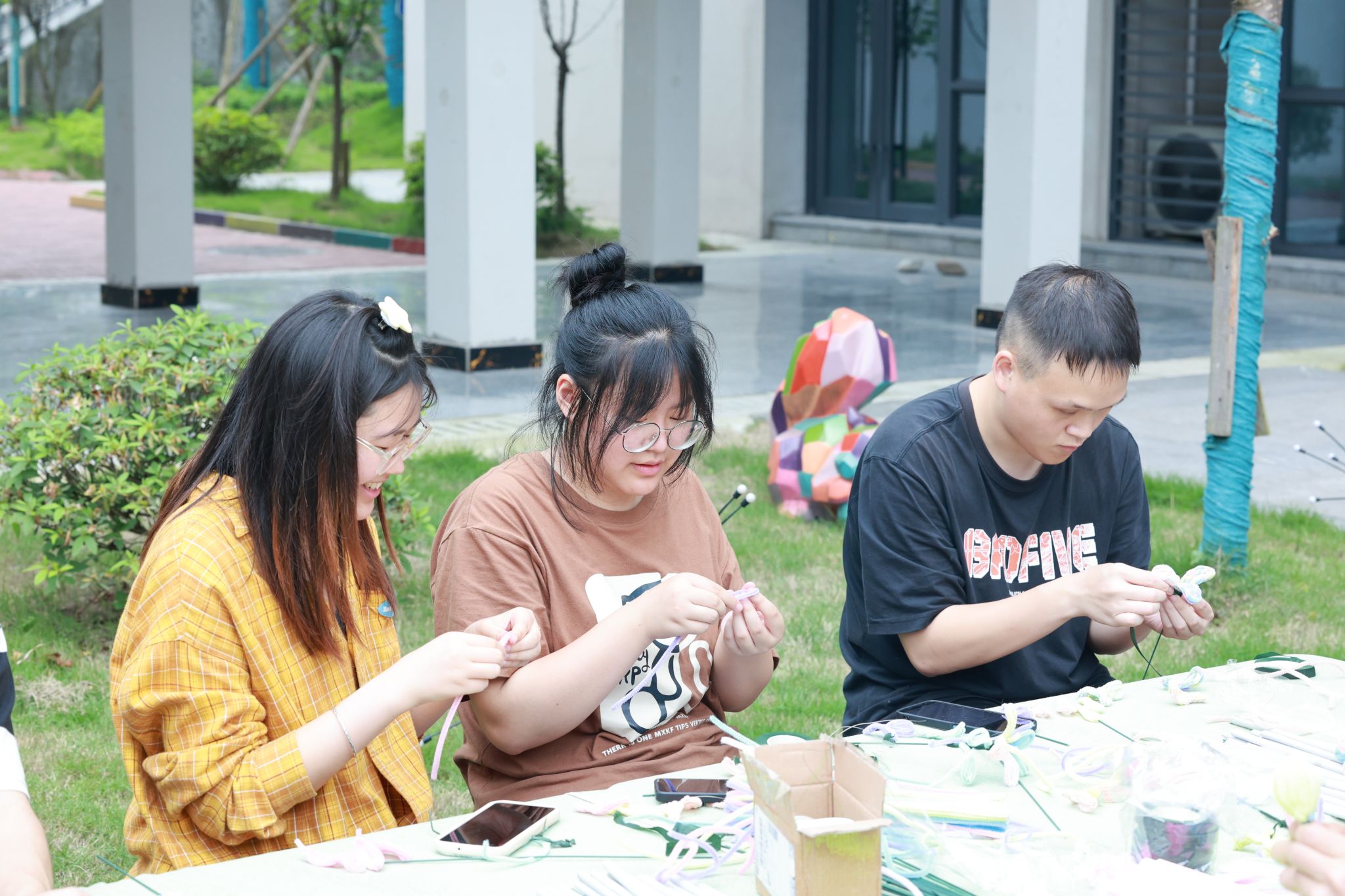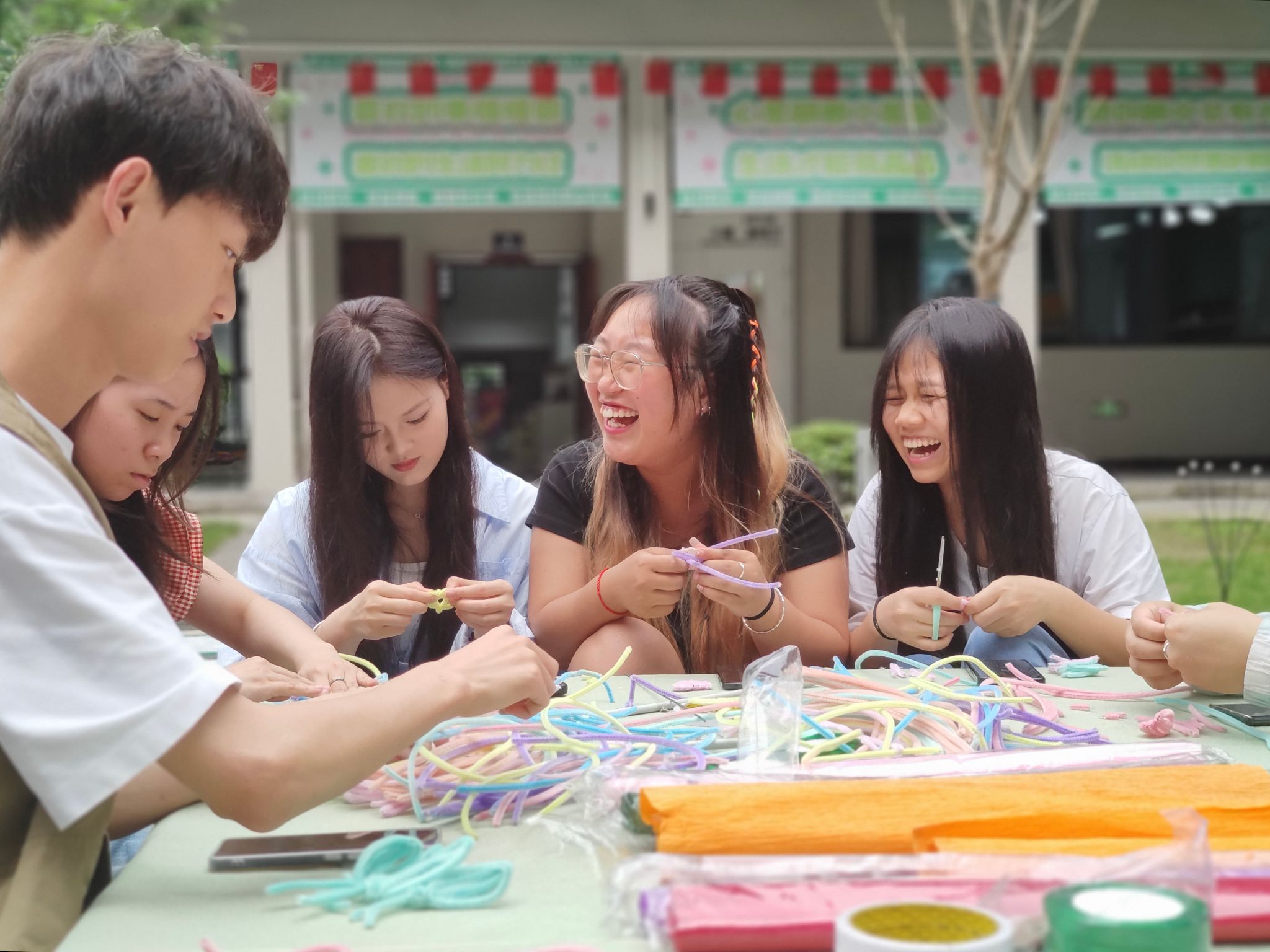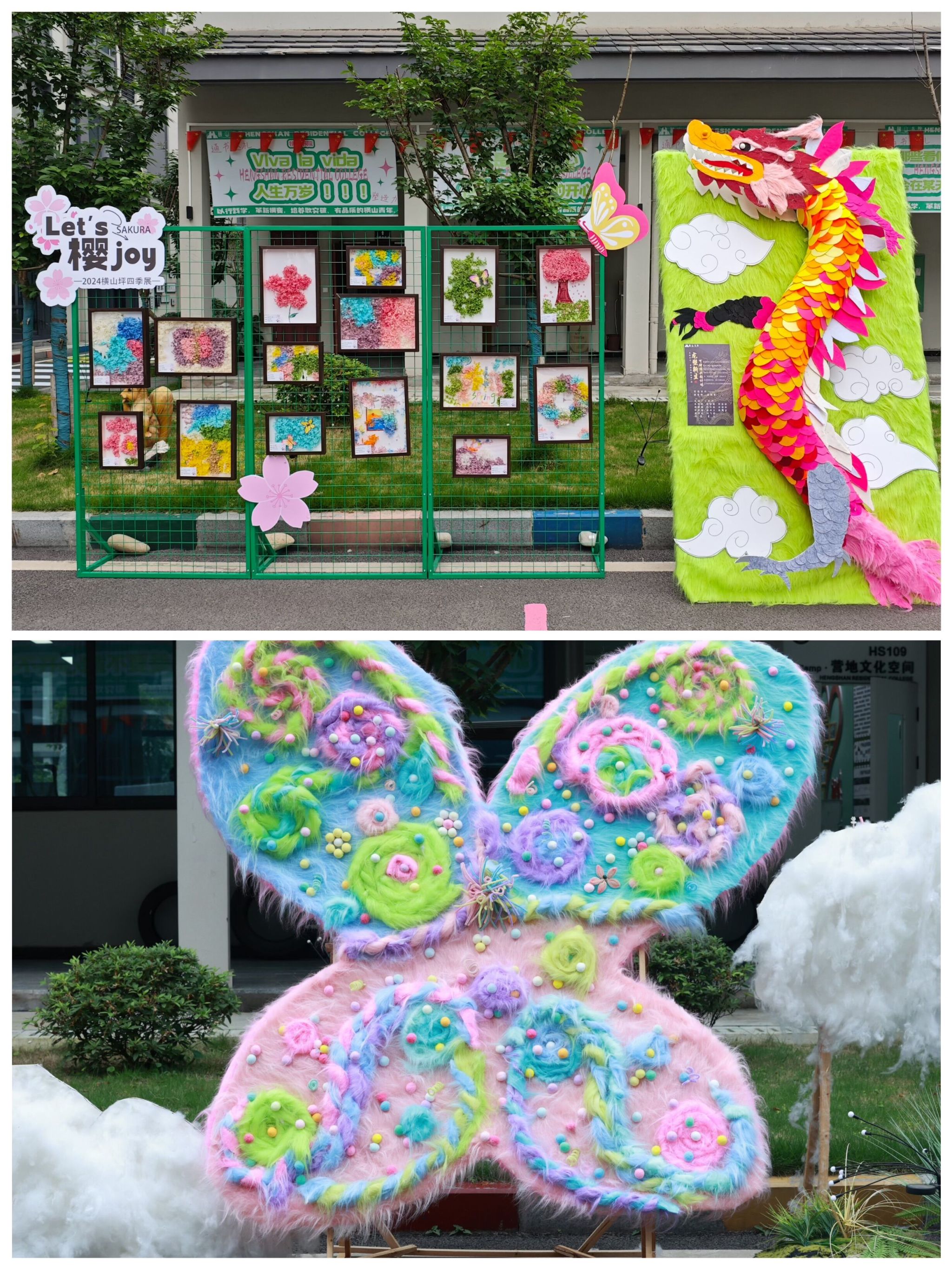 以横山书院全女子属性的住户结构为契机,结合女性力量,就“蝶变·新生”的主题开展巨型蝴蝶制作活动,于4月15日-4月30日期间,引导同学们通过利用木条、铝塑管、布料等物品对旧物进行改造重塑,赋予旧物新生命的同时,也让同学们在旧物重塑过程中,感受蝶变的生命张力。展展览当天,吸引了不少师生驻足打卡,感受这别具一格的浪漫“春日蝴蝶”。我们也希望同学们能够秉承破茧成蝶的生活态度,不断地塑造自我,与未知拥变、与自由共振。