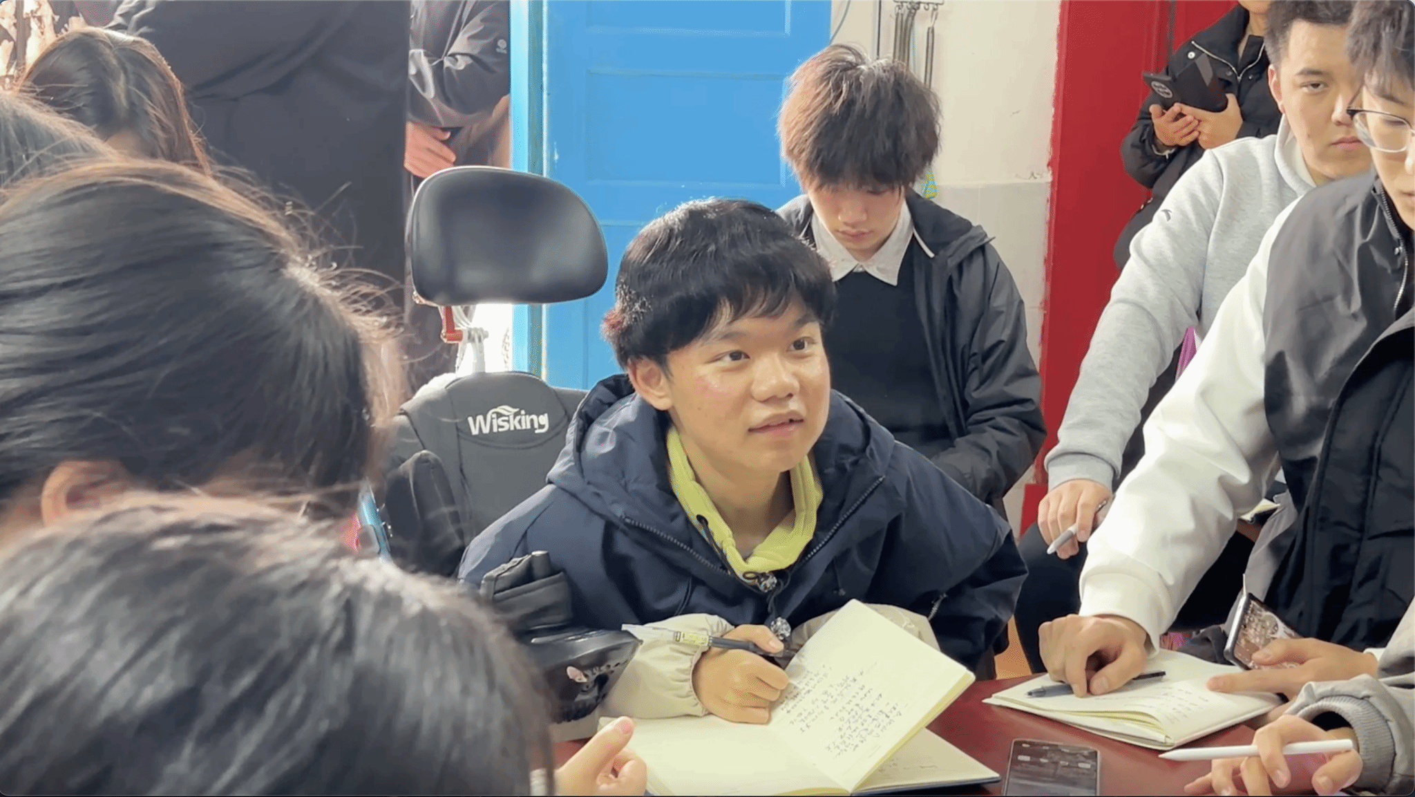 王老师还特别表现了“轮椅少年”罗睿燊同学的创作:今天是我大喜的日子,但我看到这些装饰物,便生出厌恶来。我将要和我深爱的男友分别了,母亲不许我和前男友在一起,但我跟她讲过我不想一辈子花费在不爱的人身上,母亲说他为了你什么都愿意做,但我并不想被当成宠物。这时发动机已经响起,我只能吐出四个字:等我回来!