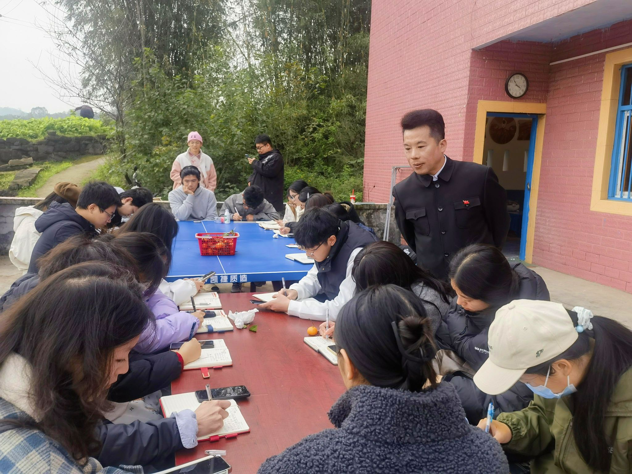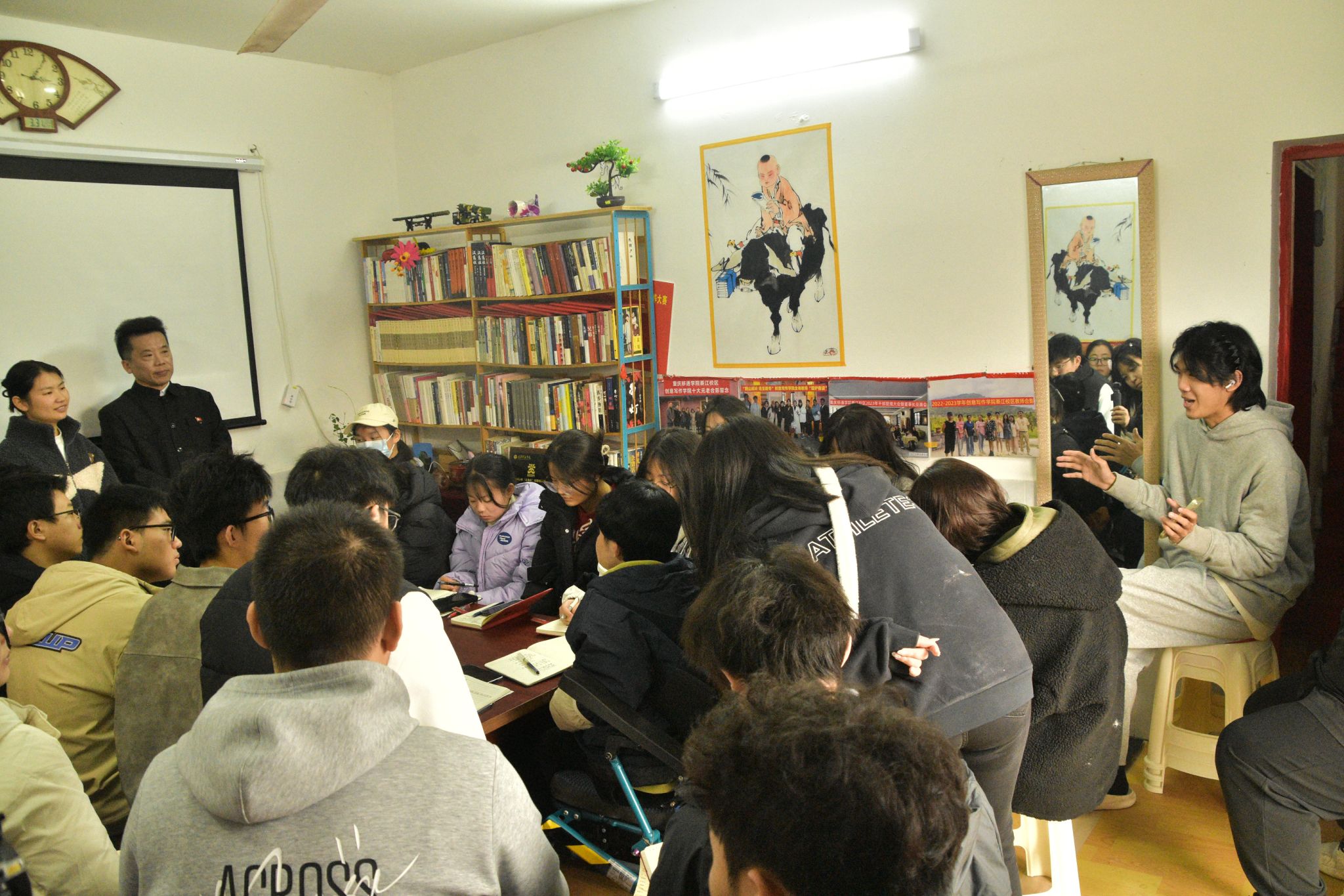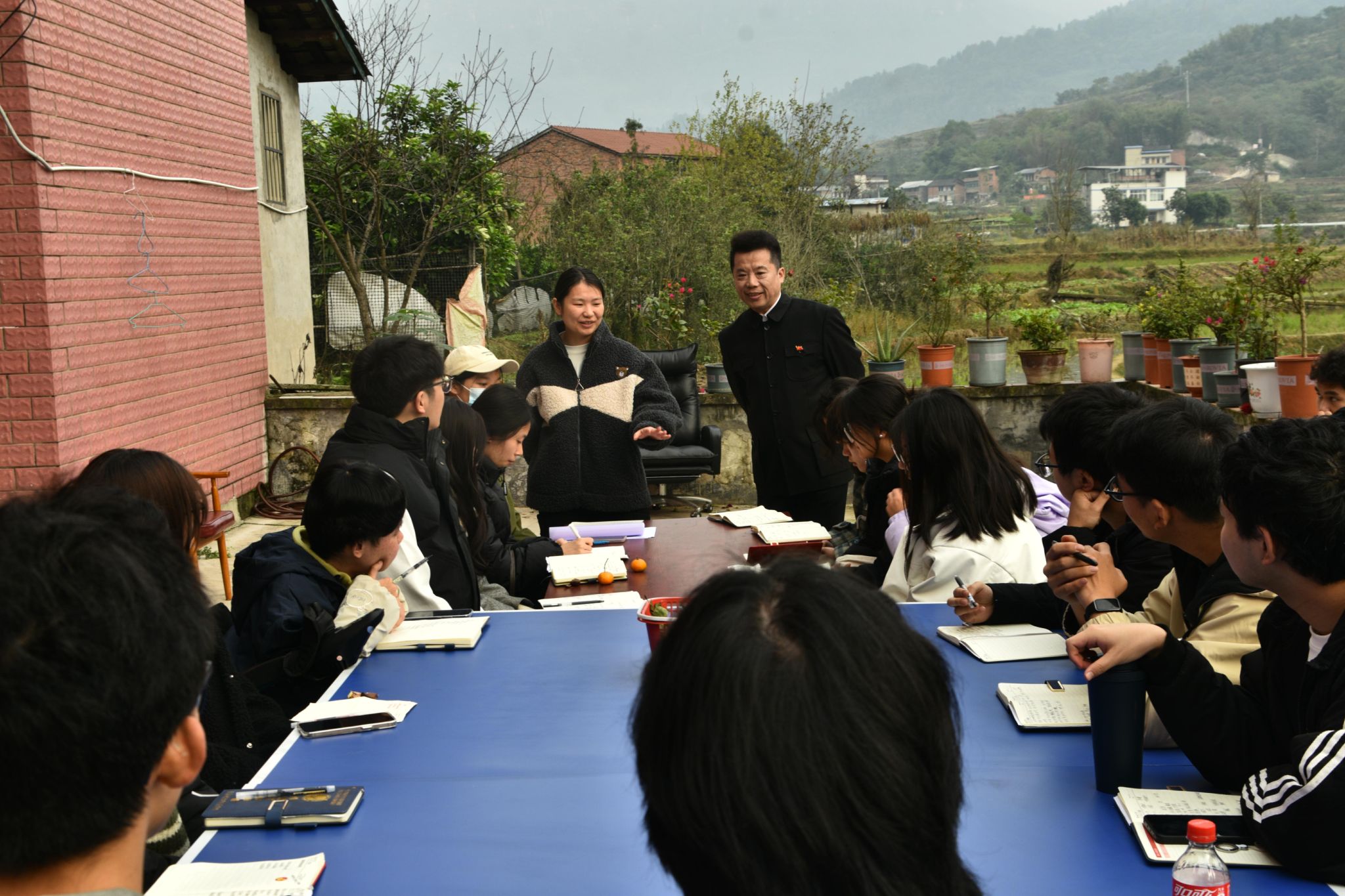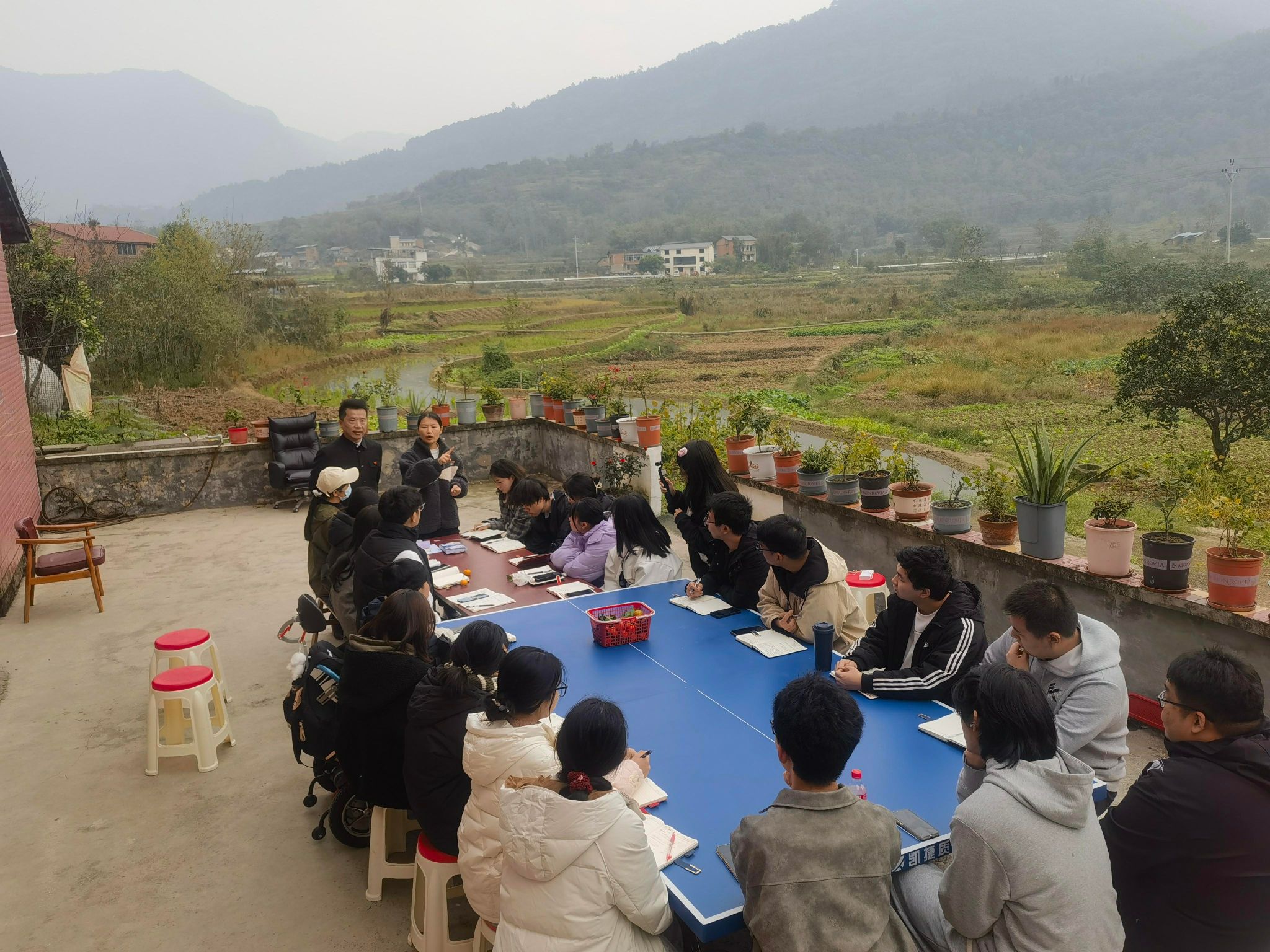 12月10日14时,微风,不冷,多云,重庆綦江登瀛街三桥村的一栋三层农家小院,室内书香浓郁,室外是无垠的田野,老瀛山笼罩在白雾中,云卷云舒。在这种别致的美景下,迎来了创意写作学院作家班非虚构工坊的全班学生和6名学生助教,一同到来的还有本课的工坊导师王恒绩和通识教学部的张新瑞老师,前来旁听观摩的还有徐瑞皓和王晓煊老师,共同开辟一场别开生面的双师授课。本次课程为《创意写作思维训练》的第14课“是什么在影响你的写作”,主题是探讨影响写作的各种路障及小说创作中的手法运用。本次双师课堂以室内研讨、室外练习的方式,为学生们带来了全新的学习体验。
