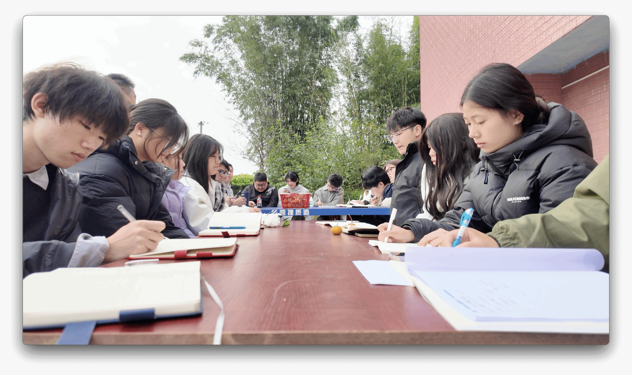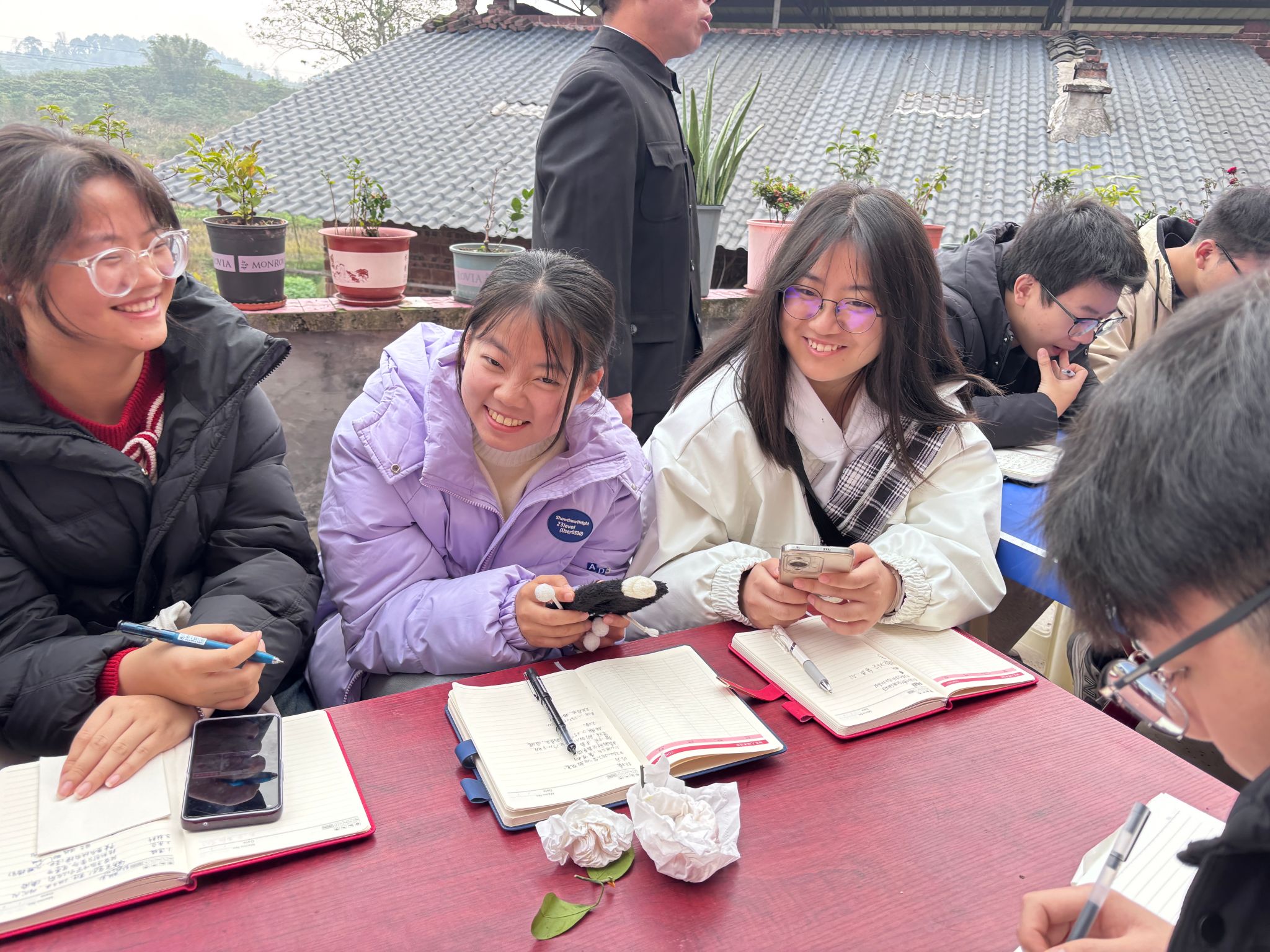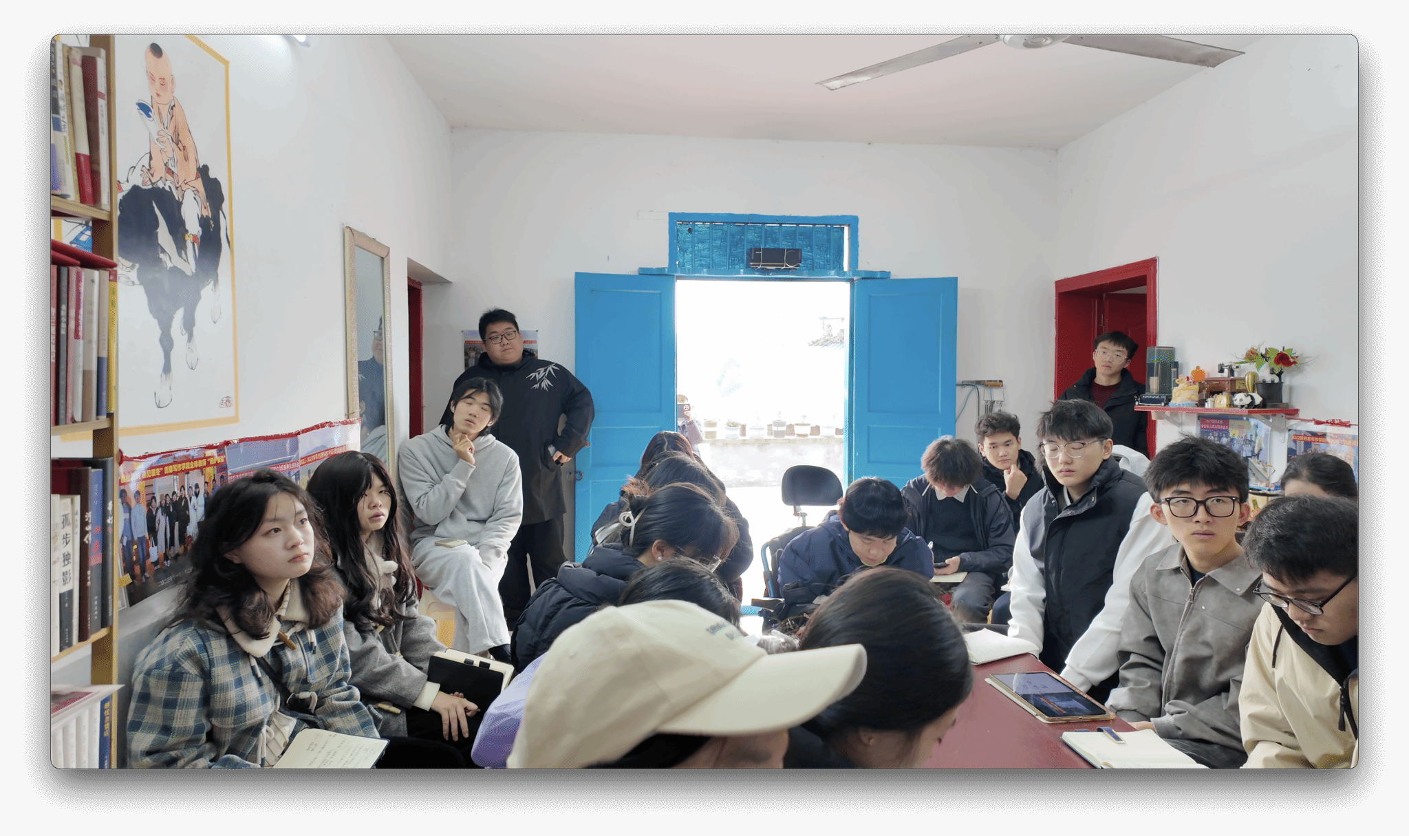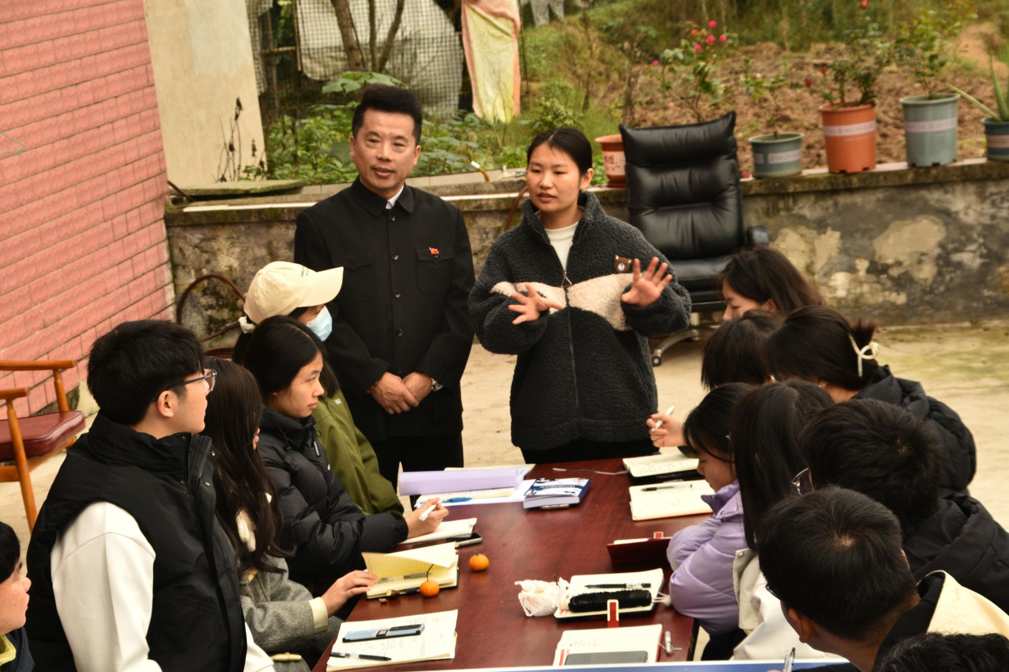 12月10日14时,微风,不冷,多云,重庆綦江登瀛街三桥村的一栋三层农家小院,室内书香浓郁,室外是无垠的田野,老瀛山笼罩在白雾中,云卷云舒。在这种别致的美景下,迎来了创意写作学院作家班非虚构工坊的全班学生和6名学生助教,一同到来的还有本课的工坊导师王恒绩和通识教学部的张新瑞老师,前来旁听观摩的还有徐瑞皓和王晓煊老师,共同开辟一场别开生面的双师授课。本次课程为《创意写作思维训练》的第14课“是什么在影响你的写作”,主题是探讨影响写作的各种路障及小说创作中的手法运用。本次双师课堂以室内研讨、室外练习的方式,为学生们带来了全新的学习体验。