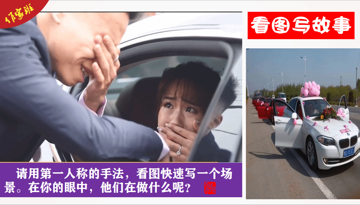 通过具体案例的分析,学生们不仅理解了各种手法的运用场景,还学会了如何灵活运用这些手法来丰富自己的作品。双师接下来的教授环节就是“看图写故事”。画面中,一个新娘正在车上流着热泪,车窗外站着一个痛哭的西装男,旁边是十几辆车的迎亲车队,他们这是在干什么呢?那个男的身份是?