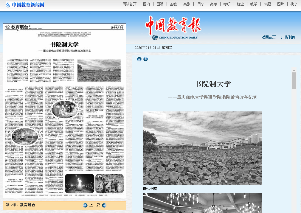 2020年,中国教育报以《书院制大学 重庆邮电大学移通学院书院教育改革纪实》为题,整版报道学校书院制建设。