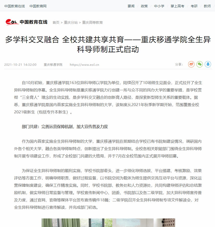 2021年中国教育在线以《多学科交叉融合 全校共建共享共育——重庆移通学院全生异科导师制正式启动》为题,报道我校特色教育全生异科导师制。