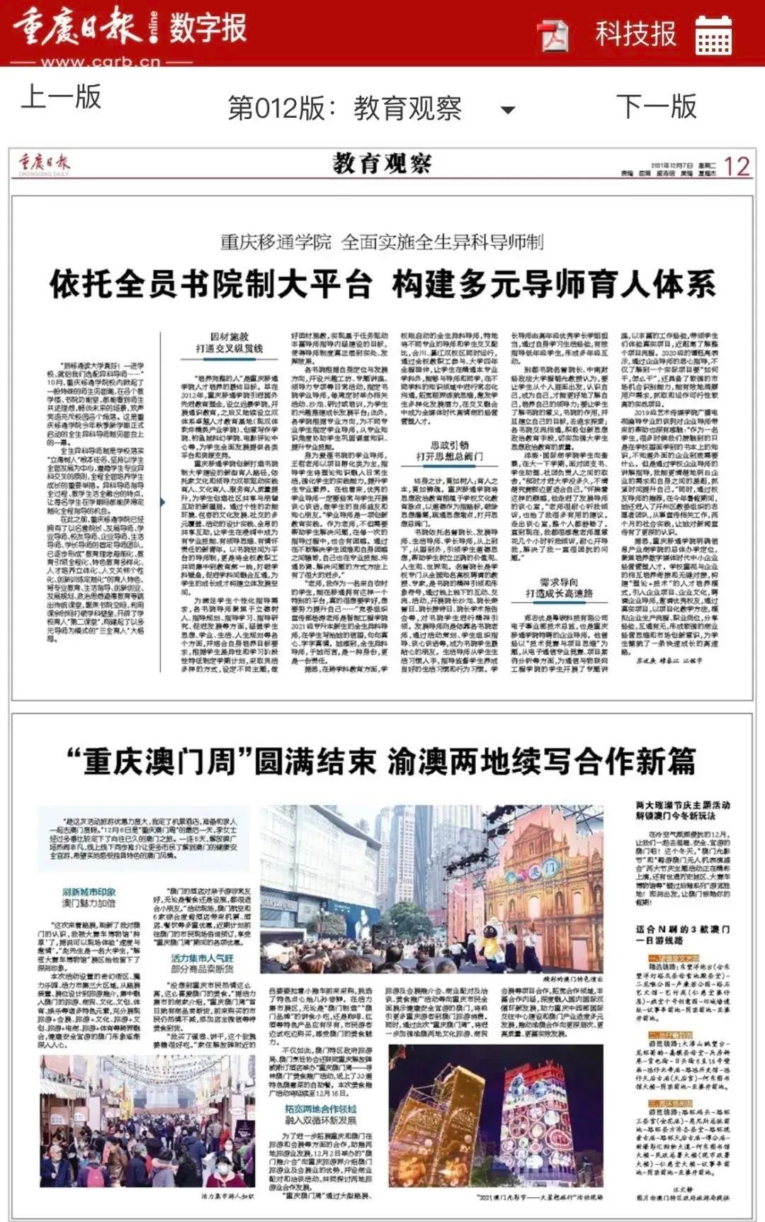 2021年,重庆日报以《重庆移通学院全面实施全生异科导师制 依托全员书院制大平台 构建多元导师育人体系》为题,报道学校多元导师育人情况。