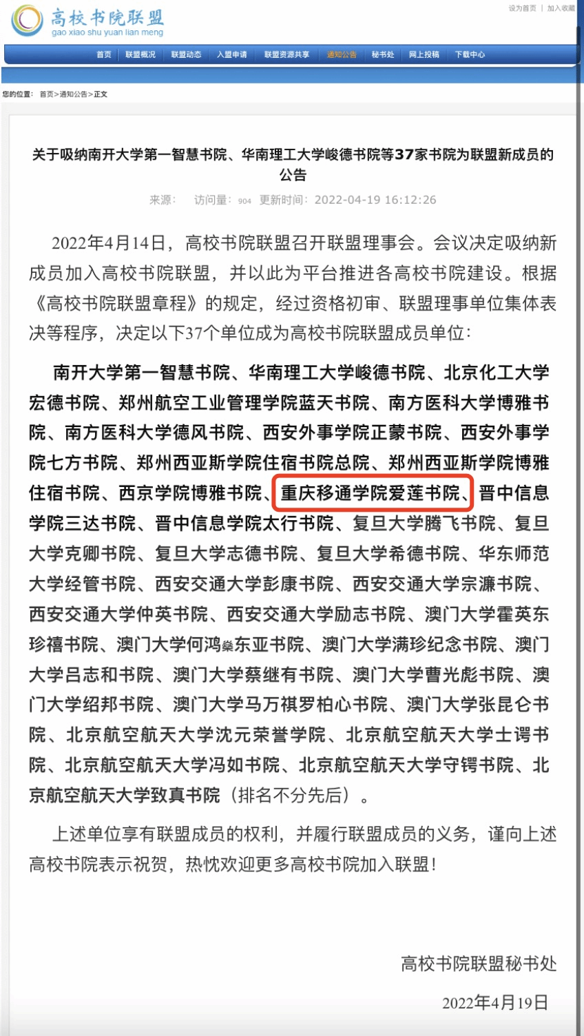 2022年,我校爱莲书院入选全国高校书院联盟。学校“生活在书院”模式也获多家权威媒体报道,接待教育部、市教委、团中央领导及市内外各大兄弟院校考察。