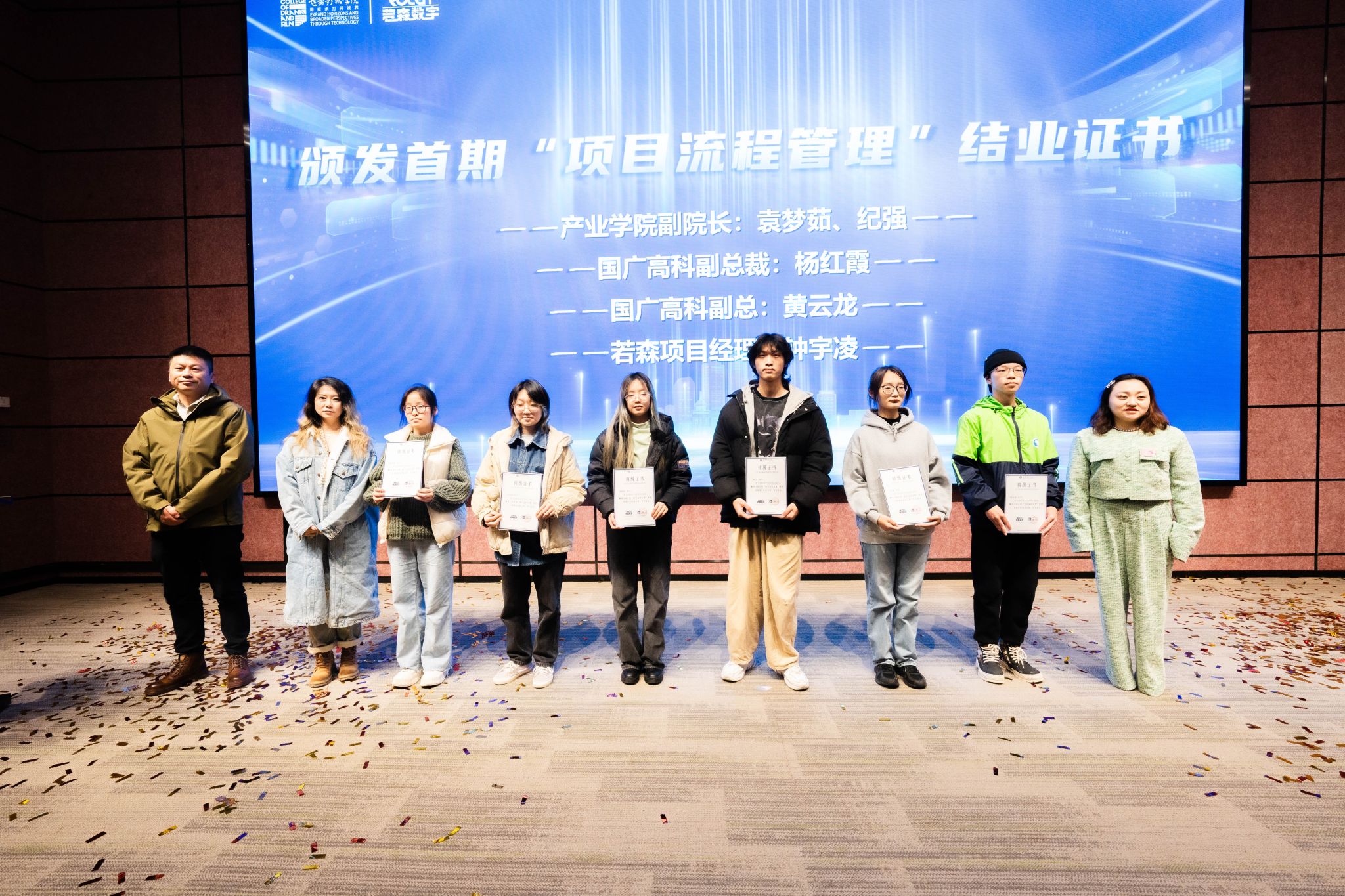12月8日,在戏剧影视学院数字动画制作产业学院的揭牌仪式上,产业学院副院长袁梦茹、纪强,国广高科副总裁杨红霞,国广高科副总黄云龙及若森项目经理钟宇凌为参与课程培训的同学颁发“项目流程管理”结业证书。袁梦茹老师在仪式上郑重介绍了本次课程培训的优秀学员,他们以优异的表现完成了学院的课程。同时,袁梦茹老师表示这次的课程不仅仅是一次培训,也是一个起点,对于学生、对于老师、对于学院而言都是一个崭新的起点。在过去的一年里,学院与企业双方都为产业学院的建立付出了艰辛的努力,相信在未来的一年学院成立的数字动画制作产业学院能够蓬勃发展。