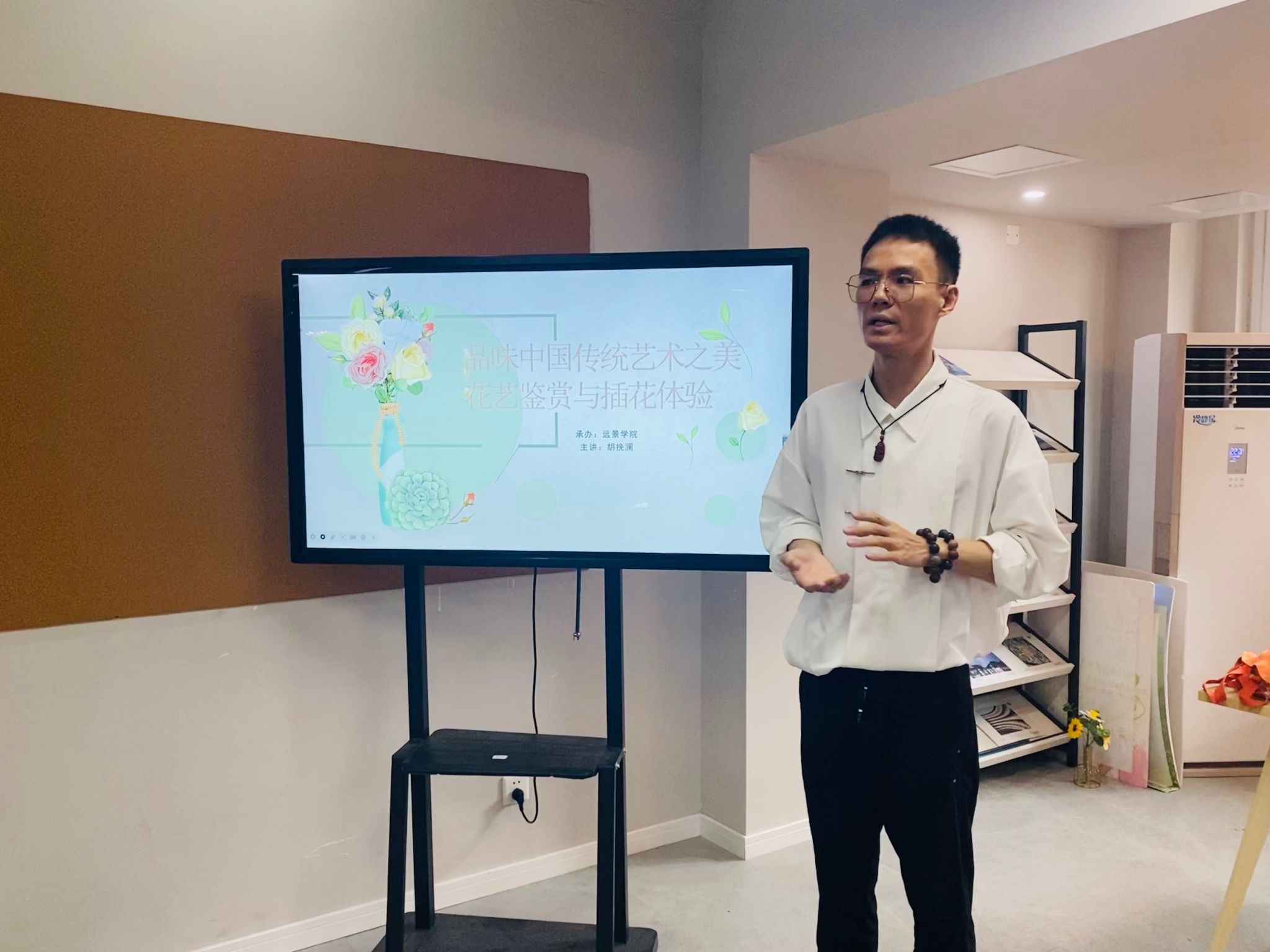活动伊始,胡老师为大家讲解了插花艺术的基本知识。他介绍了插花艺术的定义及其工艺,包括修剪、整枝、弯曲和艺术处理等,展示了插花作品的诗情画意。接着胡老师阐述了东方式、西方式、中国式和日本式插花的特点,并特别讲述了宋代插花与文人审美的关系,让参与者深入了解各种风格的插花艺术及其历史文化。