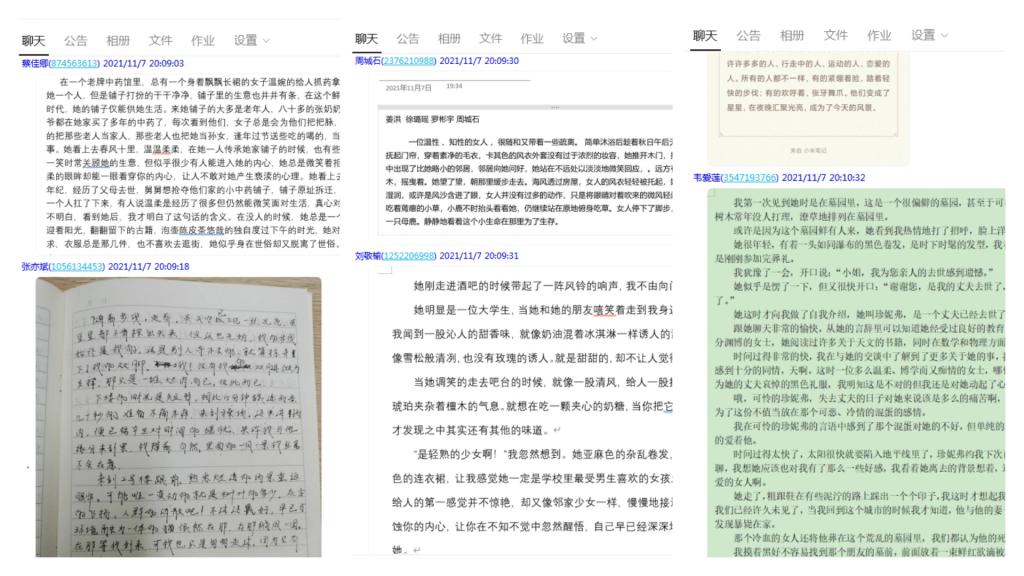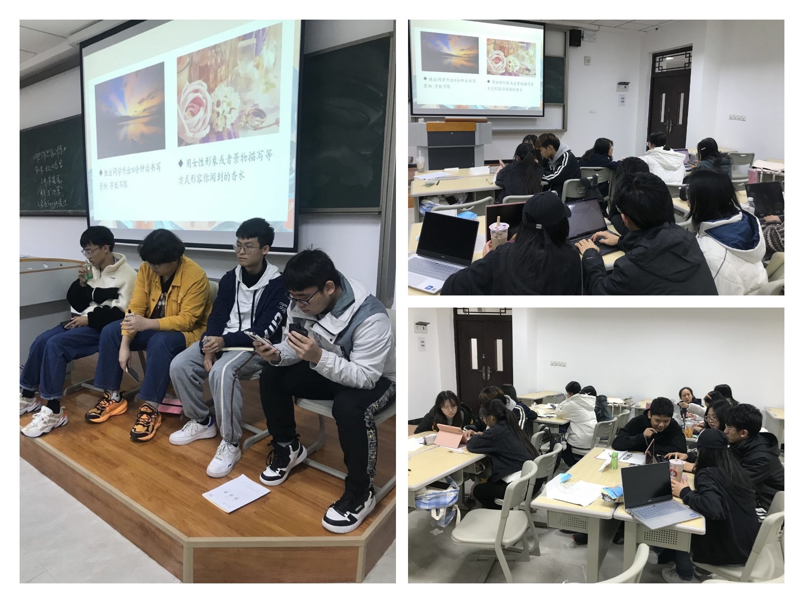 同学们纷纷行动起来,或交换香水感受不同的气味,或激烈讨论如何进行准确的刻画。十五分钟很快过去,外出的同学回到教室后,苏老师要求每位同学在二十分钟内写1000字,大家随即陷入安静的书写之中。不知过了多久,QQ群内陆续有同学上传课堂练习,老师让大家选出小组代表作,然后请四名写夜景的男同学到讲台,针对描述辨别香水。韦爱莲同学把主人公设置为身着黑色礼服的寡妇,具有悬疑的故事情节;刘敬榆同学写到:“她刚走进酒吧的时候带起了一阵风铃的响声,我不由向门口看去。她明显是一位大学生,当她和她的朋友嘻笑着走到我身边的时候,我闻到一股沁人的甜香味,就像奶油混着冰淇淋一样诱人的甜品,不像雪松般清冽,也没有玫瑰的诱人。就是甜甜的,却不让人觉得腻味。”姜洪、徐璐瑶、罗彬宇和周城石同学合作完成一段优美的文字:“一位温性、知性的女人,很随和又带着一些疏离。 简单沐浴后趁着秋日午后天气稍凉,她轻抚起门帘,穿着素净的毛衣,卡其色的风衣外套,没有过于浓烈的妆容。她推开木门,抬头之间,余光中出现了比她略小的邻居,邻居向她问好,她站在不远处以淡淡地微笑回应。远方有几排零散的松木,摇曳着。她望了望,朝那里缓步走去。海风透过房屋,女人的风衣轻轻被托起,她的眼里有些许湿润,或许是风沙含进了眼,女人并没有过多的动作,只是对着吹来的微风轻阖眼睛,小鹿在远方吃着蔫瘪的小草,小鹿不时抬头看看她,仍继续站在原地俯身吃草。女人停下了脚步,她仿佛这时是一只母鹿,静静地看着这个小生命在那里为了生存。”