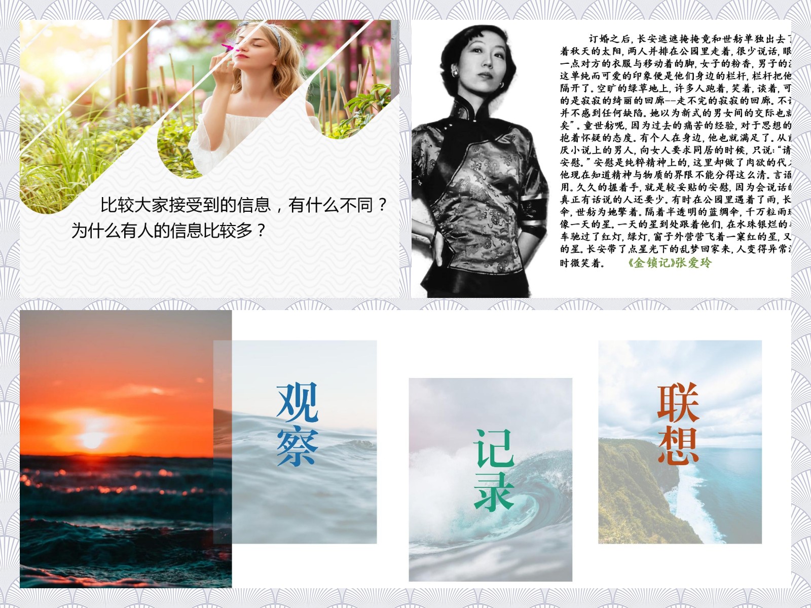 一番辨别之后,有两组代表成功的从文字里找出了对应的香水。苏老师向我们呈现了四款香水的广告文案,让我们进行对比,她说:“创意写作不仅限于培养传统文学的作家,也培养面对文化创意产业各个写作环节的一切需要的写作人才,比如广告文案的撰写等。”在对“闻香”和“观景”的学生习作进行分析后,苏老师又为我们讲解了张爱玲《金锁记》中长安与童世舫约会的场景,让我们讨论在这段文字里,张爱玲调动了哪些感官来感受和描写。我们明显看到了自己与大师的差距,如苏老师所说:张爱玲的比喻,依据本体与喻体的相似性建立起复杂交织的对应关联,借助读者的审美积淀,通过暗示、引发人联想的方式,使整个意蕴显示出超乎寻常的丰富性。