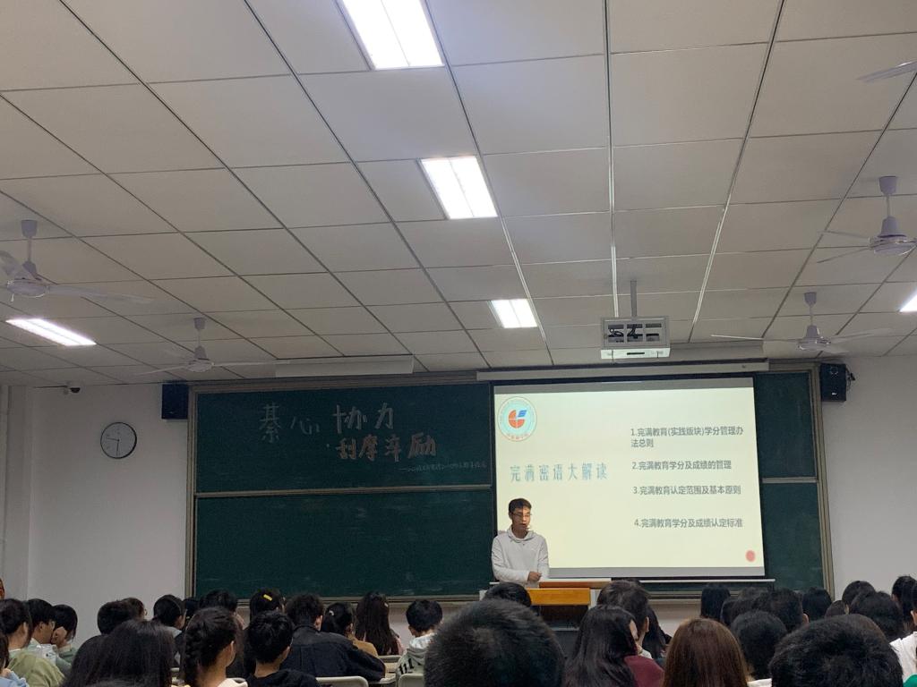 在这次活动上,年级长尹云晖上台激情的为大家解读完满教育制度,帮助同学们全面发展,根据社会对人才的现实需求,助力同学们培养自己的完满人格,以及清晰了解学校完满学分制度。清晰的逻辑配上演示文稿,幽默风趣的言语让同学们很快就明白、掌握完满教育制度。年级长尹云晖提醒大家要有一颗积极向上的心态,才能在这样的制度中表现优异,发挥人生光彩,同学们对新颖的制度充满了兴趣,眼睛中迸发出充满了对学分势在必得的自信光芒。