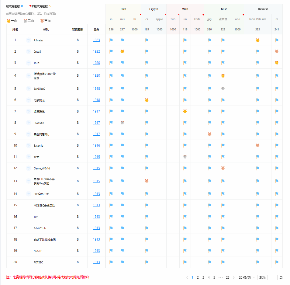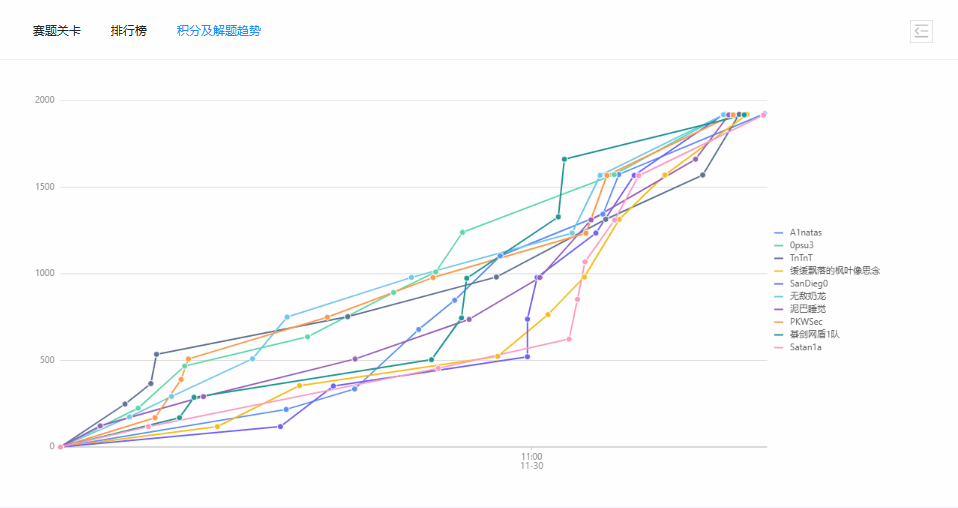 随着比赛的深入,排名顺序不断变动,最高分持续被刷新。选手们凭借卓越的技能和深厚的专业知识,在网络世界中展开了一场场精彩绝伦的攻防战。他们协同互助,不断适应和应对各种变化,在竞赛中充分展示了大学生网络安全精英的风采。下面这张解题趋势图,如实记录了竞赛过程中的激烈程度。