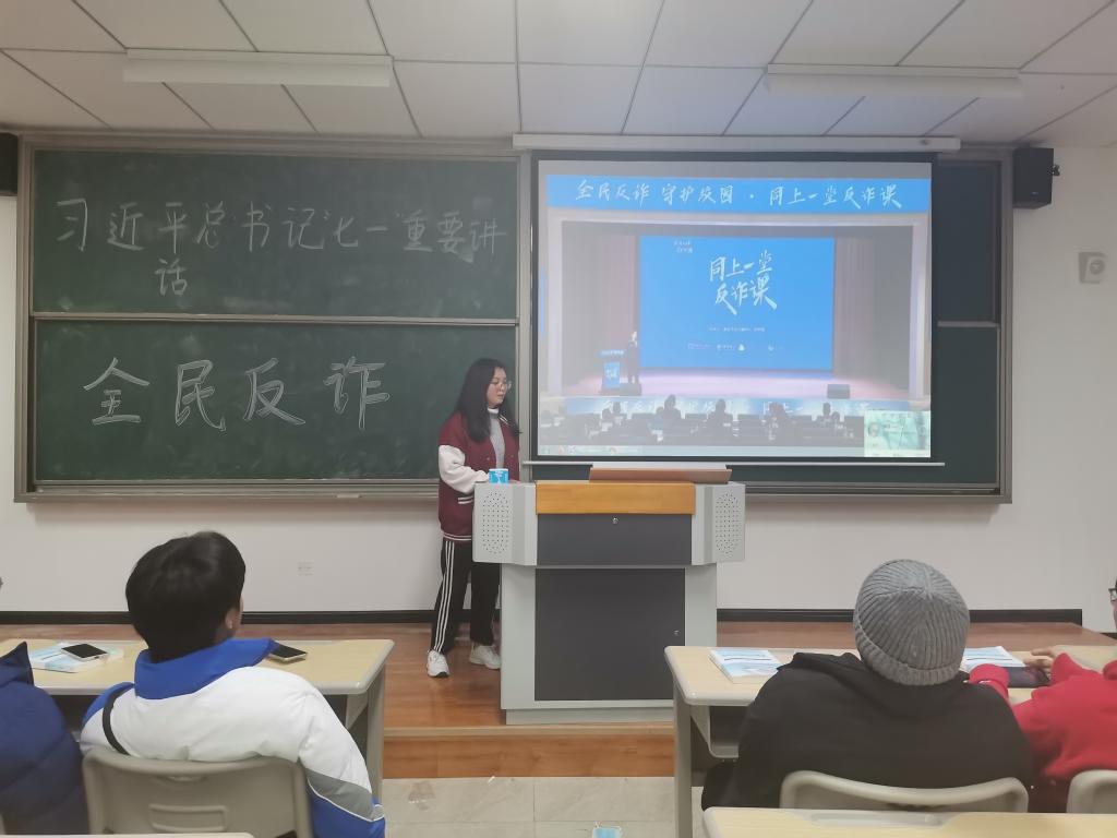 此次反诈骗宣讲主要以播放视频及演讲的形式开展。班长胡纯菲播放了“同上一节反诈课”发布活动的视频,由反诈专家为大家解读最新的诈骗案例,讲解实用的防诈措施。反诈视频详细分析了“刷单类诈骗”“贷款类诈骗”“冒充客服类诈骗”“杀猪盘诈骗”“虚假购物类诈骗”五种常见诈骗类型,告知同学们作案方法新、洗钱速度快、犯罪人员专业化等都是现代电信诈骗的显著特征。各式各样的电信诈骗可谓防不胜防,日益增长的立案数量和不断攀升的涉案金额更为同学们敲响了警钟。团支书黄鑫为班级同学演讲了一段“预防诈骗小口诀”,以朗朗上口的音韵将防诈诀窍刻入同学们的脑中,用诙谐的言语道出诈骗的罪恶。从而让同学们切实体会到在这个信息化的社会,具备一定的信息安全意识的重要性,借此来提高同学们对社会中信息推送的警惕性。这警示学生们树立正确消费观,避免过度超前消费,不要轻信“低利率”“放款快”等诱惑性字眼。