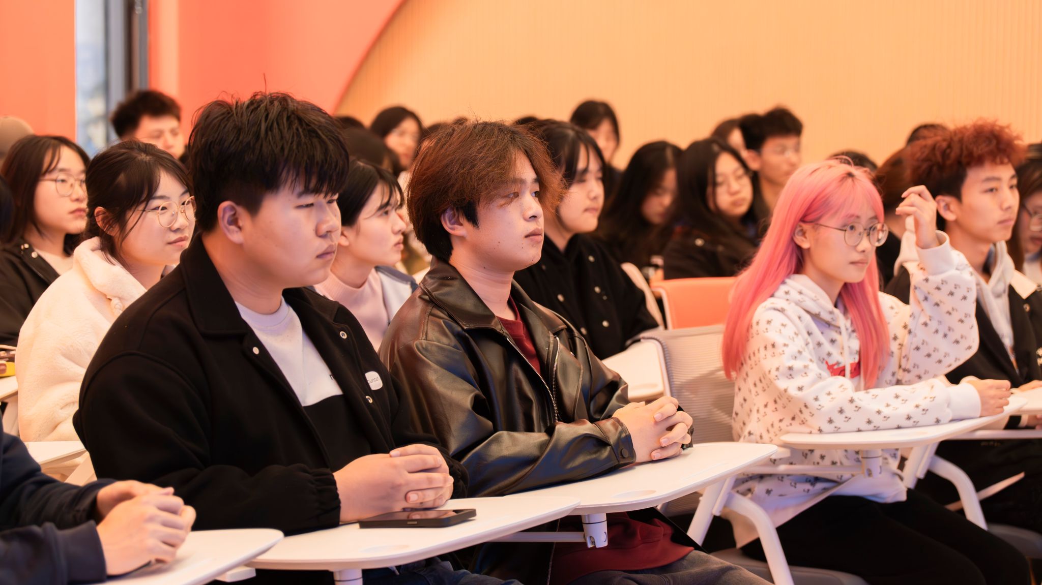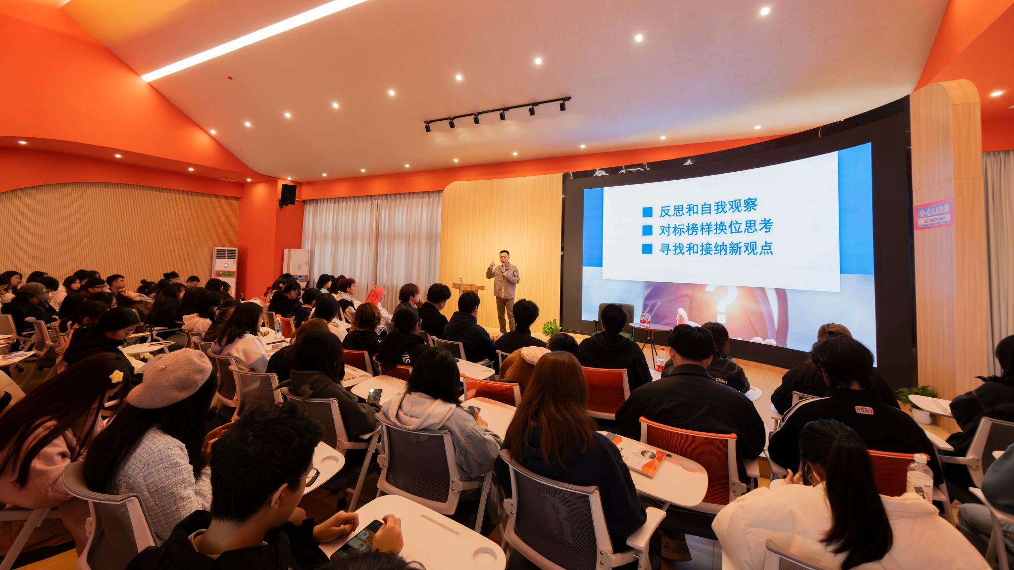 冯总以平凡和不平凡的话题引入,抛出成为一个优秀的人需要做出相应改变的核心观点,他的观点主要从认知、行动、心态以及形象四个方面展开。认知方面,冯总提到同学们需要打开认知,具有反思和自我观察的能力,在学习和工作中对标身边人为榜样并且做到换位思考,还要不停寻找和接纳新的观点,更新自己的观念,与时俱进;行动方面,冯总鼓励同学们勇敢迈出第一步,不要自我设限,想到就立即去做,逐渐形成一个能力累计的过程;心态方面,冯总从自己工作中遇到过的事情举例,认为心态决定一切,在企业工作中应该抱着“大事不大,小事不小”的心态对待每一件事,并且以结果为导向,告诉同学们在企业发展中有必要体现自己的结果价值;形象方面,冯总重点从责任心和口碑两个点讲述了自己的观点,他认为口碑具有长尾效应,这与人际交往的信任度直接关联,一个人的口碑会影响到企业的形象。分享过程中,冯总还与同学们进行了有趣味的互动问答,用同学们感兴趣的方式提出了在企业工作中应该多点好奇心、善于模仿学习、多交友多交流以及保持平常心的观点,还打趣的跟同学们分享了“职场委屈三件套”,整个分享会氛围轻松愉快。