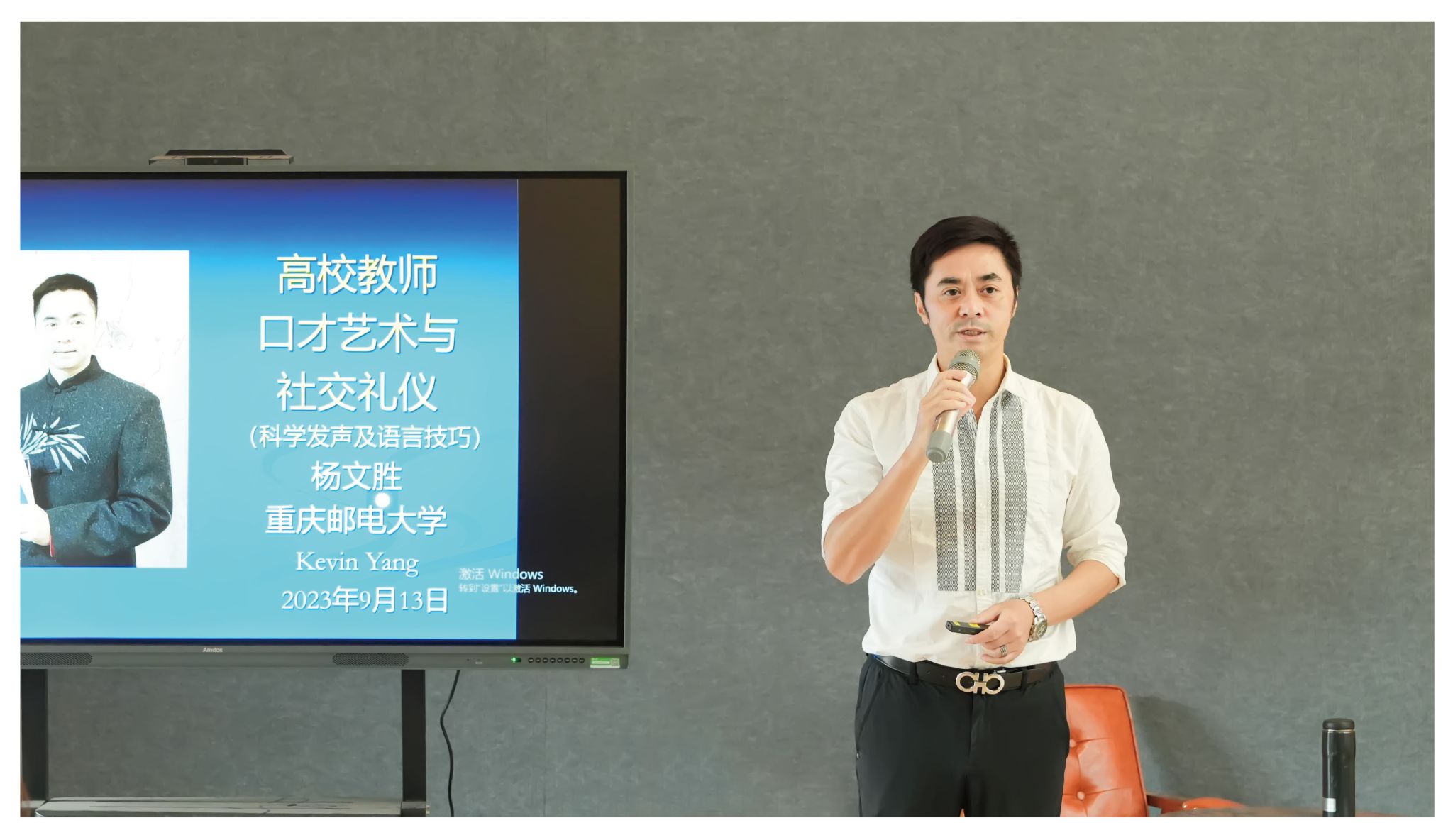 博学于文,约之以礼。为积极响应学校加强师德师风全面建设的号召,全面提高教师的文明素养,树立教师良好的职业形象,培养教师良好的行为规范,全面提高教师职业道德水平,建设高素质的师资队伍。2023年9月13日下午,戏剧影视学院邀请重庆邮电大学《普通话公众演讲》课程教师、美国迈阿密Dadw学院汉语言文化客座教授杨文胜老师到校,开展关于“高校教师口才艺术与社交礼仪”的专题培训。讲座由戏剧影视学院副院长王芳院长主持,学院全体老师参加了本次培训。